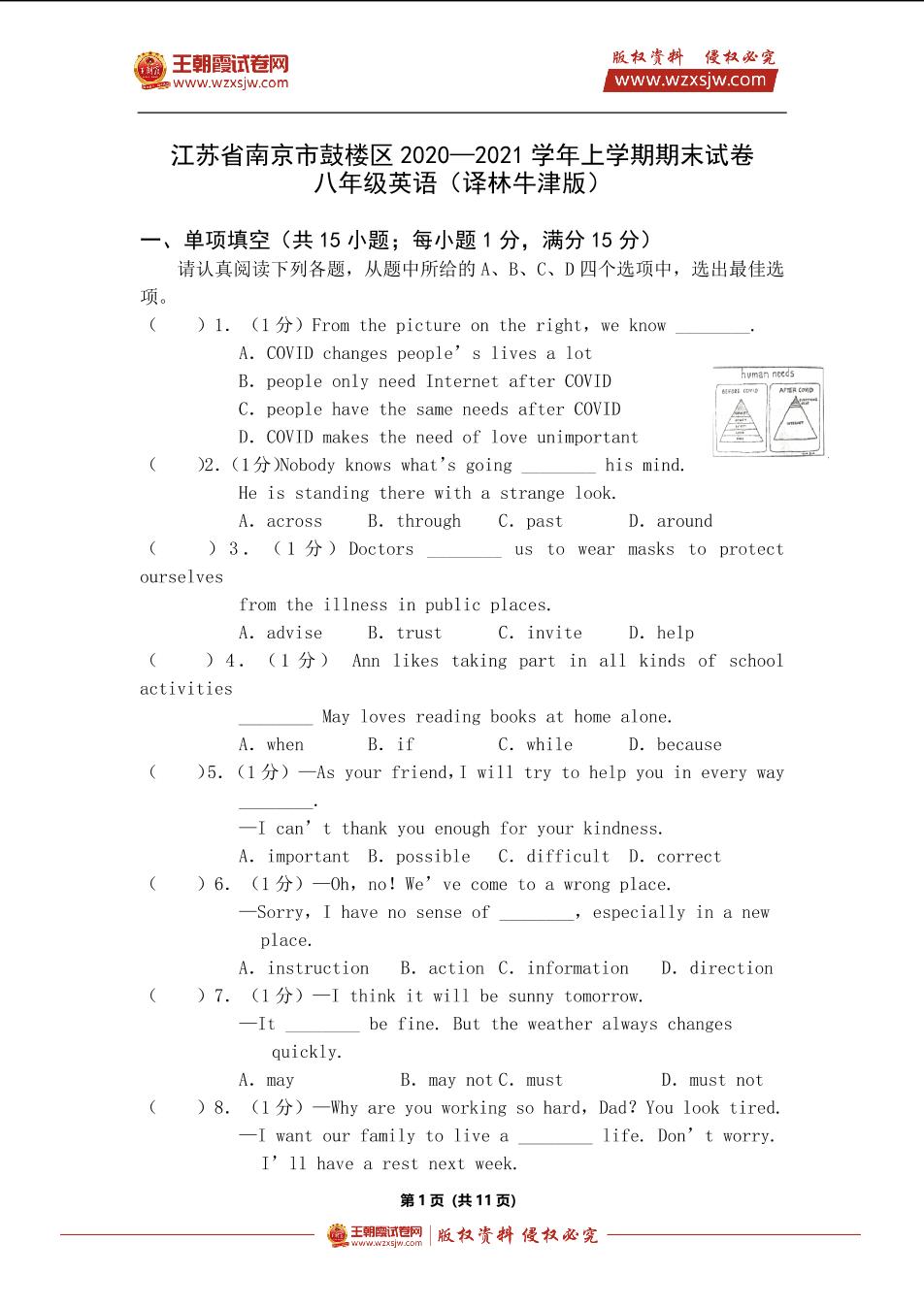 江苏省南京市鼓楼区2020—2021 学年度第一学期期末试卷八年级英语(译林牛津版)【无听力音频】