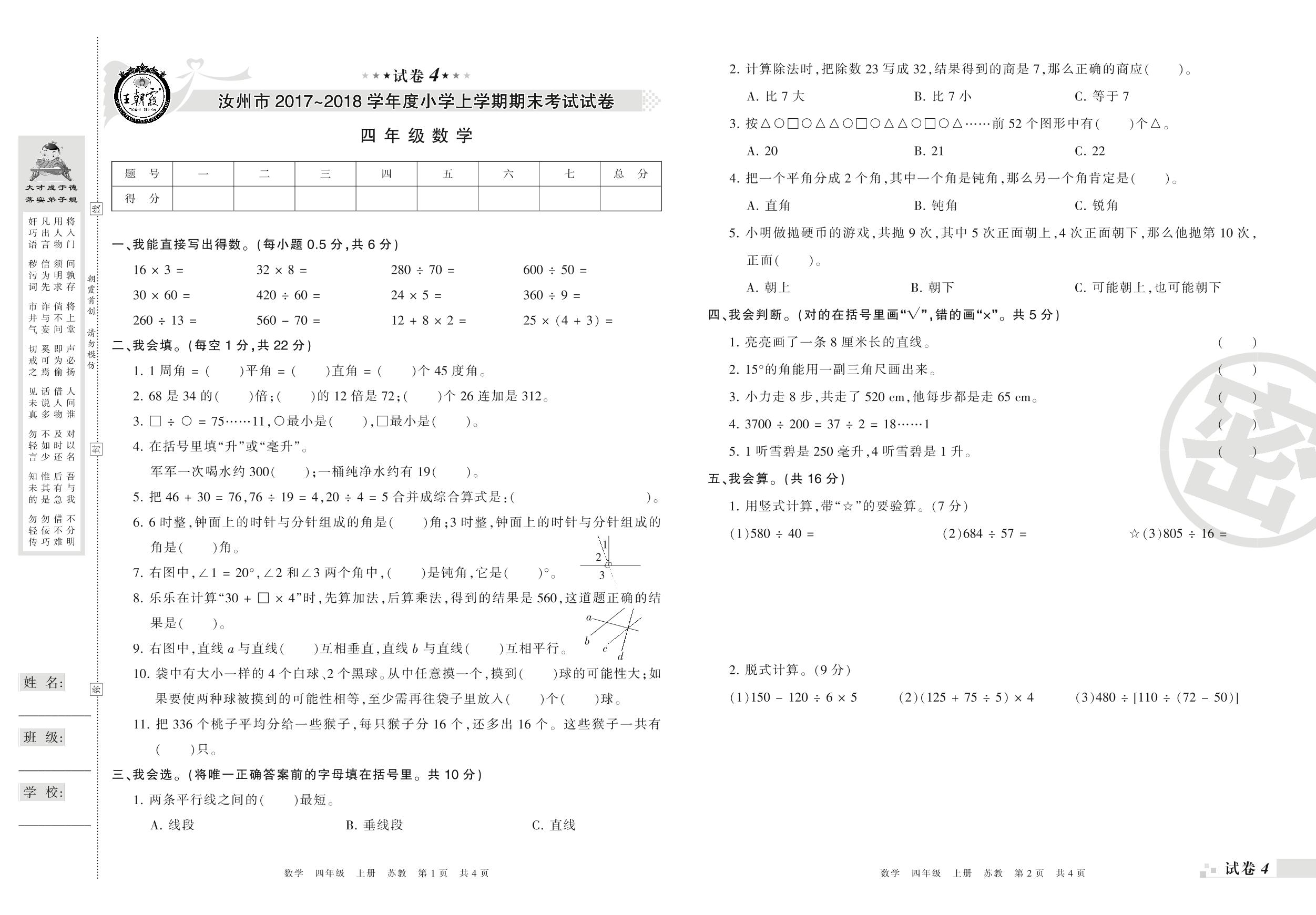 2017-2018学年第一学期汝州市四年级数学试卷(苏教版)【4】