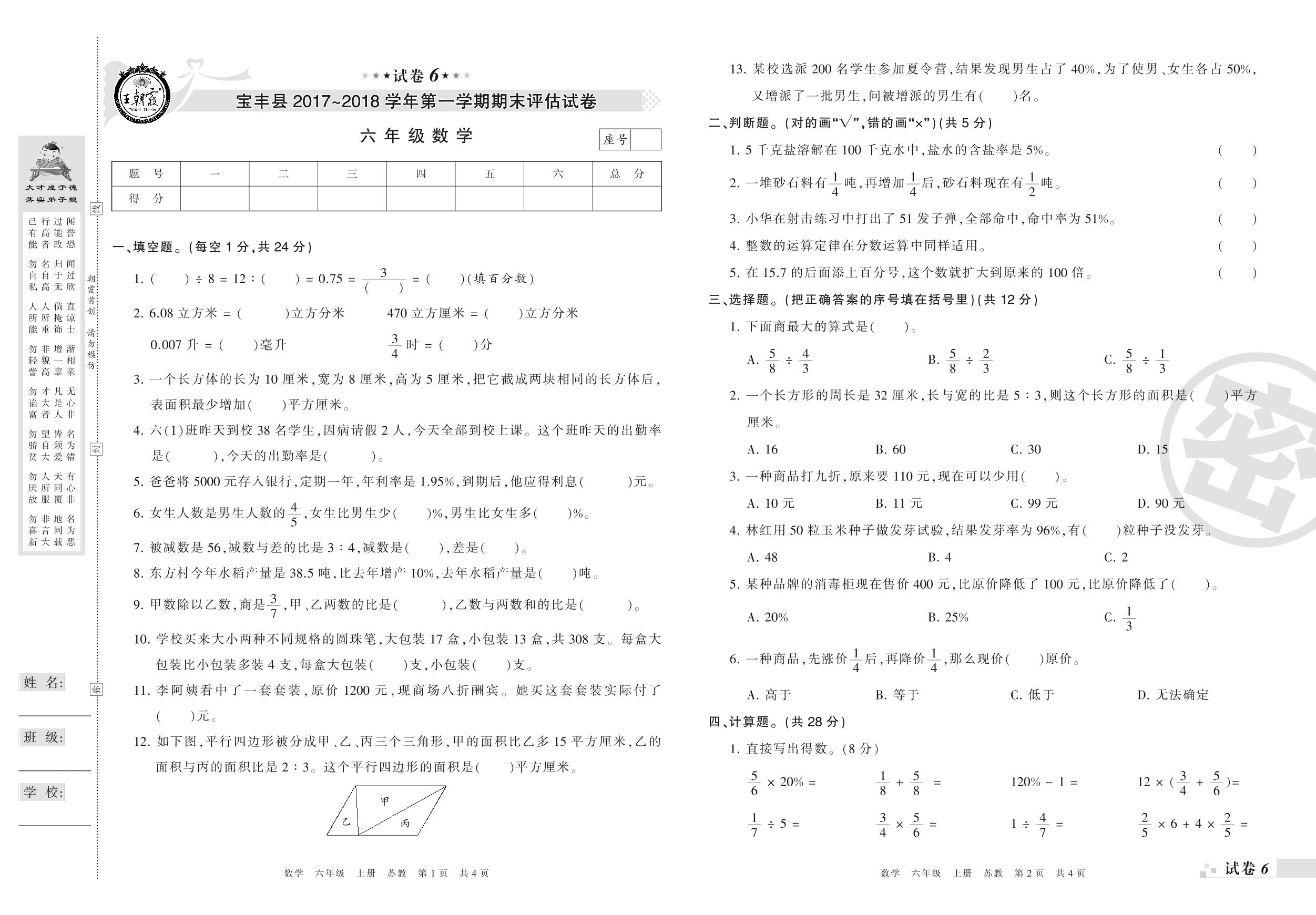 2017-2018学年第一学期平顶山市宝丰县六年级数学试卷(苏教版)【6】