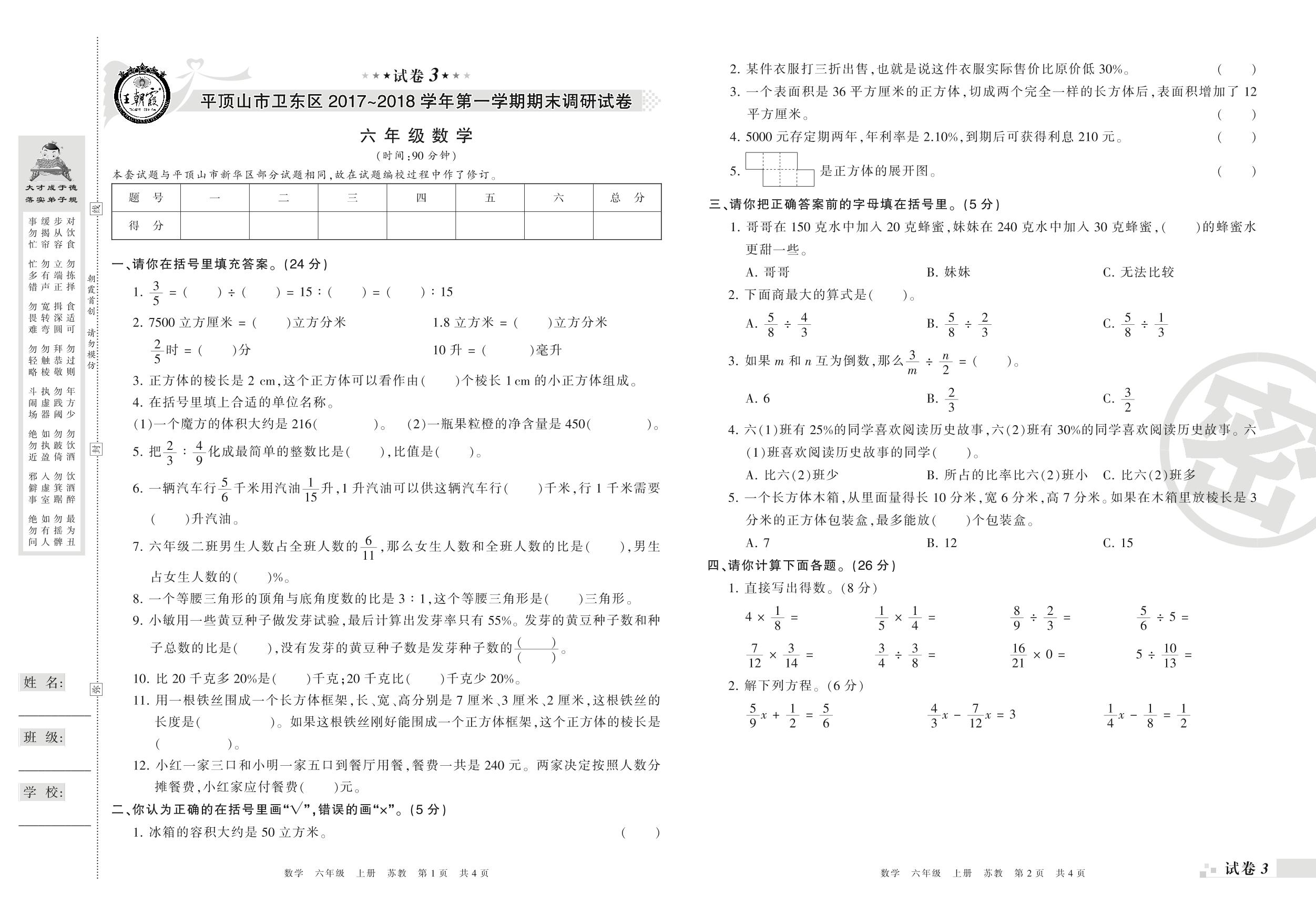 2017-2018学年第一学期平顶山市卫东区六年级数学试卷(苏教版)【3】