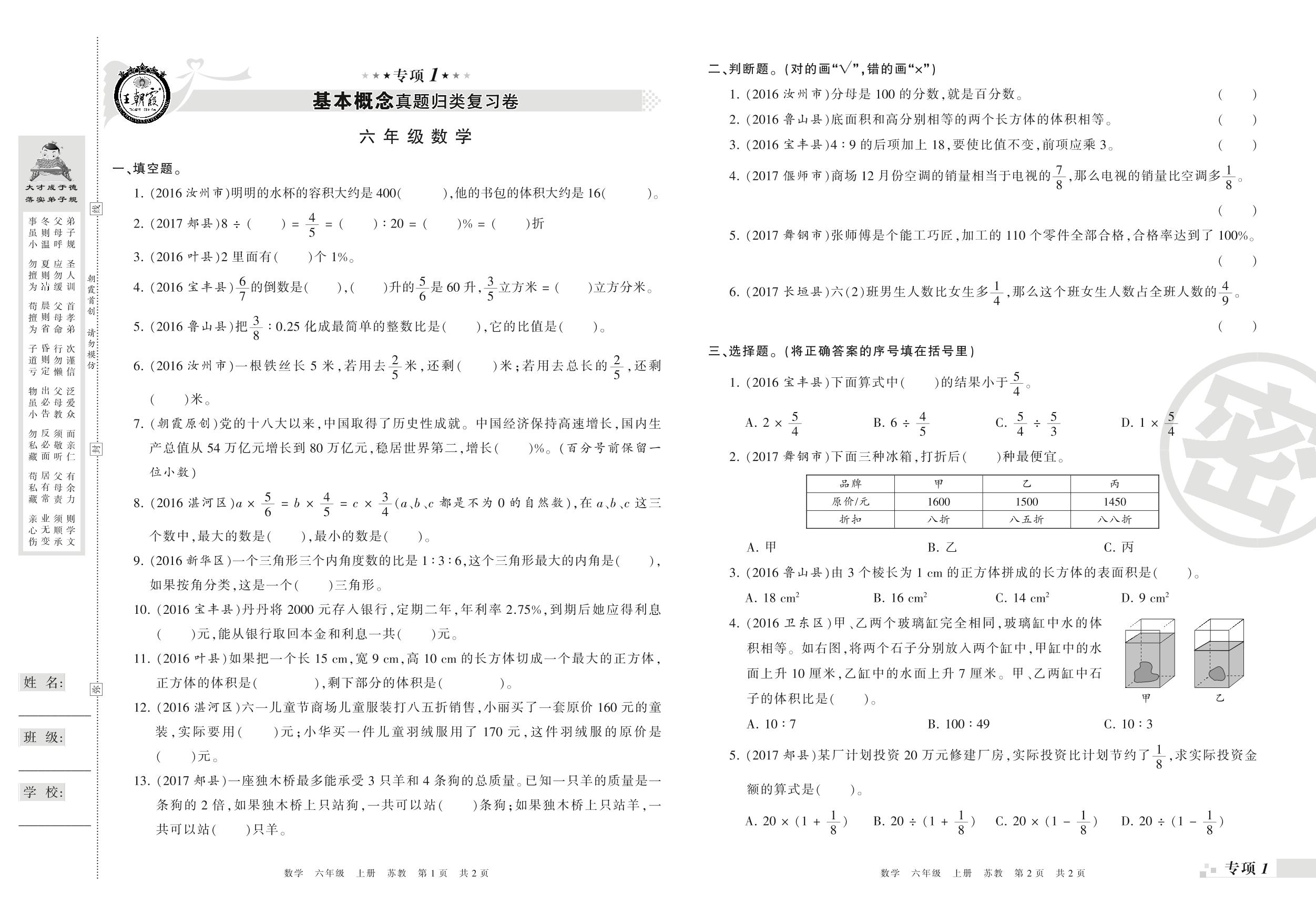 王朝霞期末专项卷——基本概念、计算真题归类复习卷六年级上册数学(苏教版)【0】