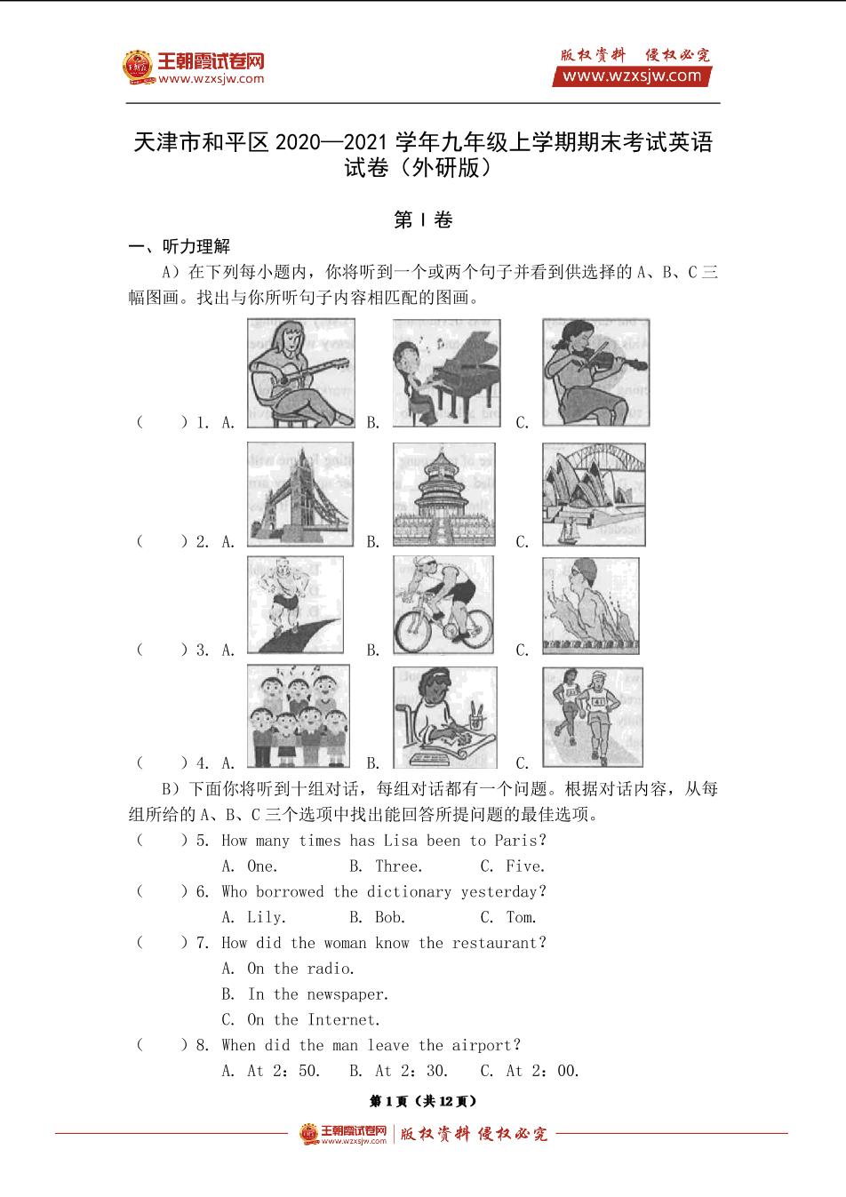 天津市和平区2020—2021学年九年级上学期期末考试英语试卷(外研版)【无听力音频】