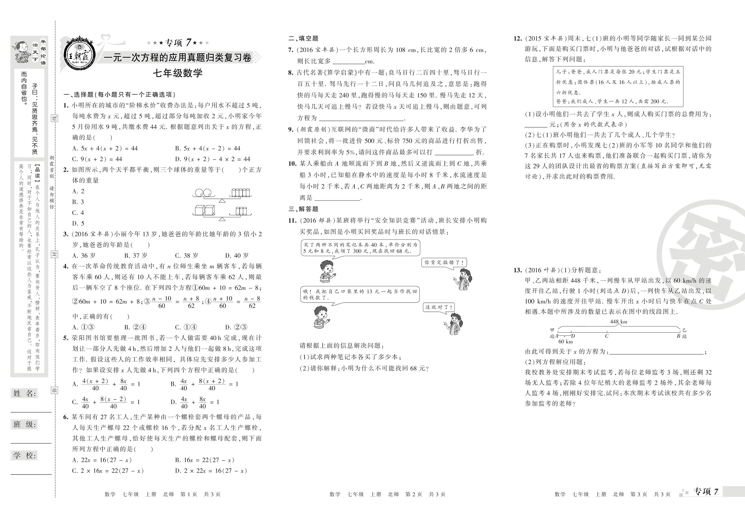 王朝霞期末专项卷——一元一次方程的应用、数据的收集与整理真题归类复习卷七年级上册数学(北师版)【0】