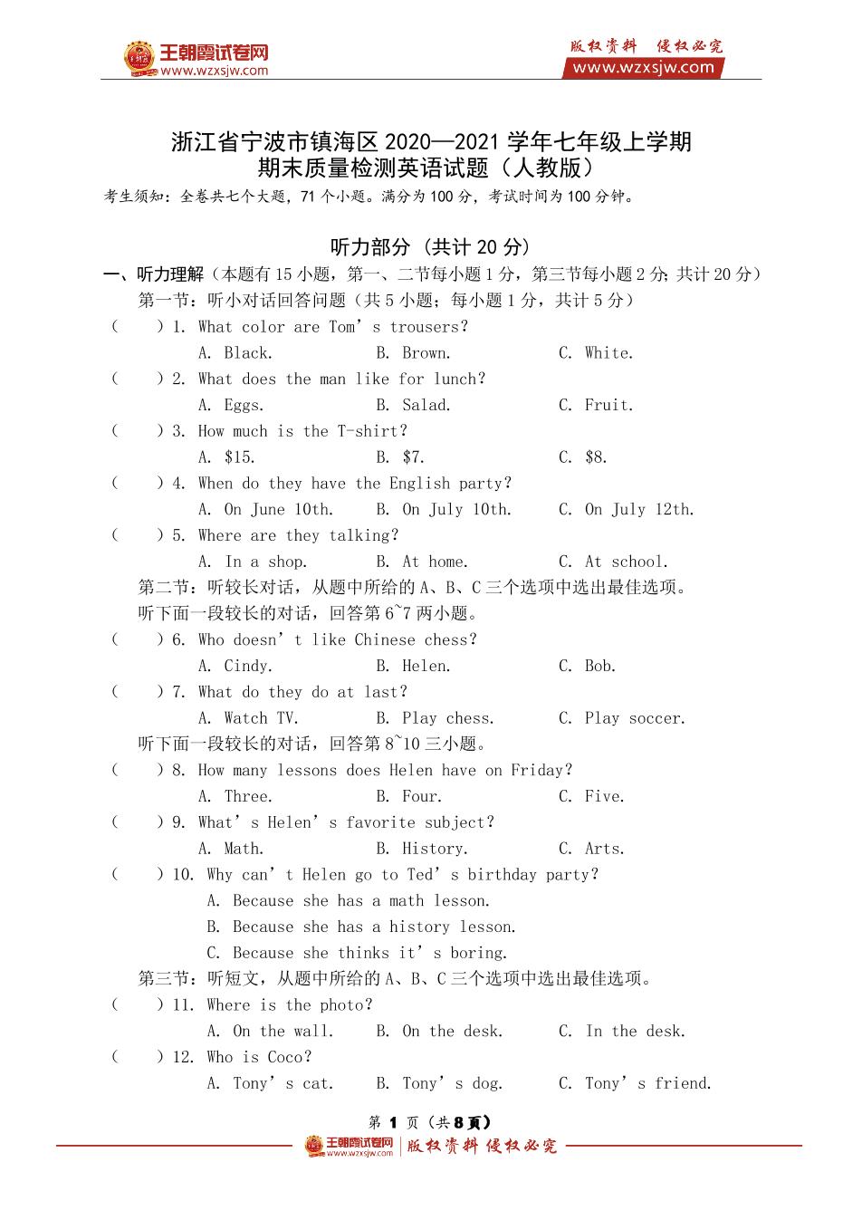 浙江省宁波市镇海区2020—2021学年七年级上学期期末质量检测英语试题(人教版)【无听力音频】