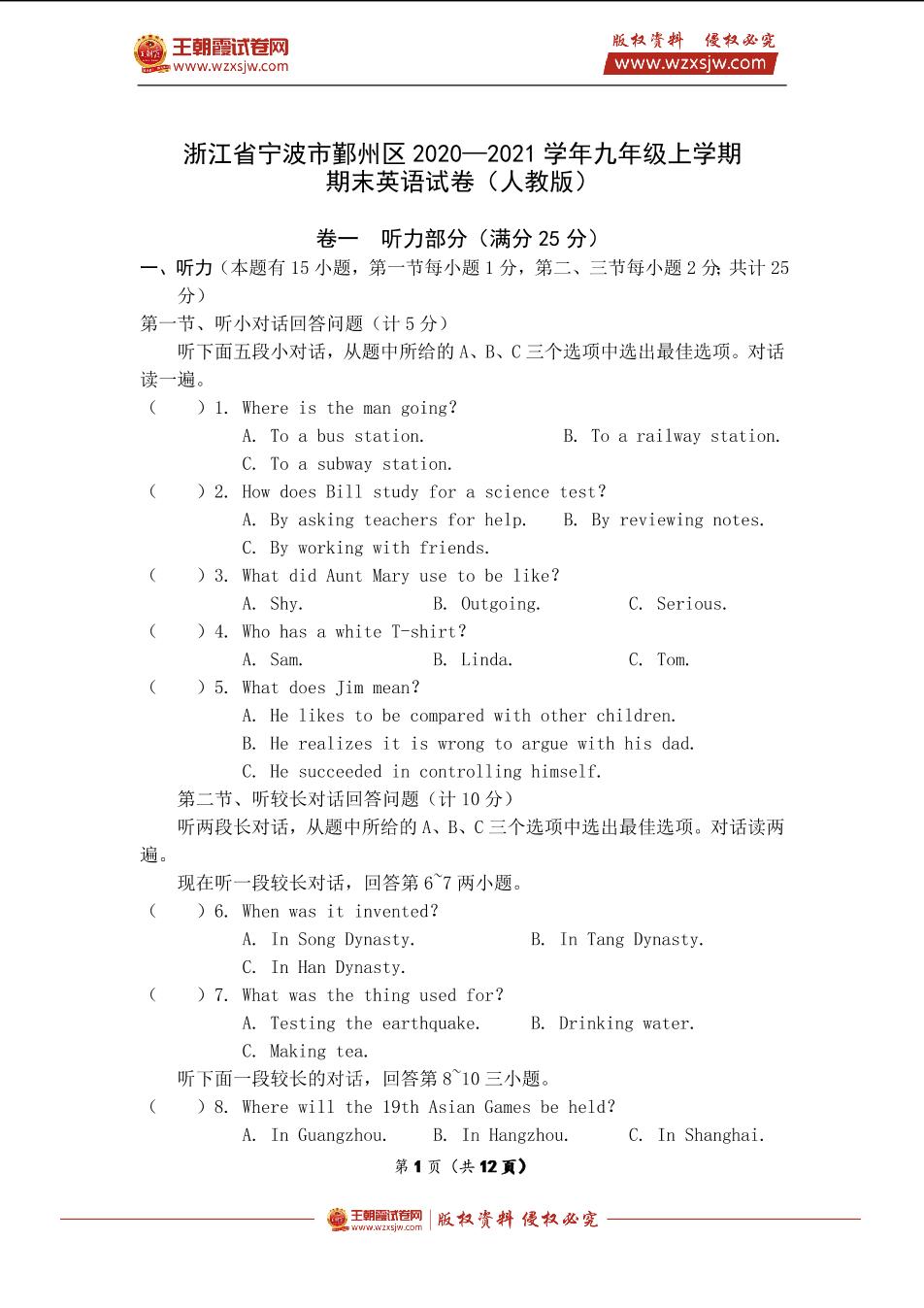 浙江省宁波市鄞州区2020—2021学年九年级上学期期末英语试卷(人教版)【无听力音频】