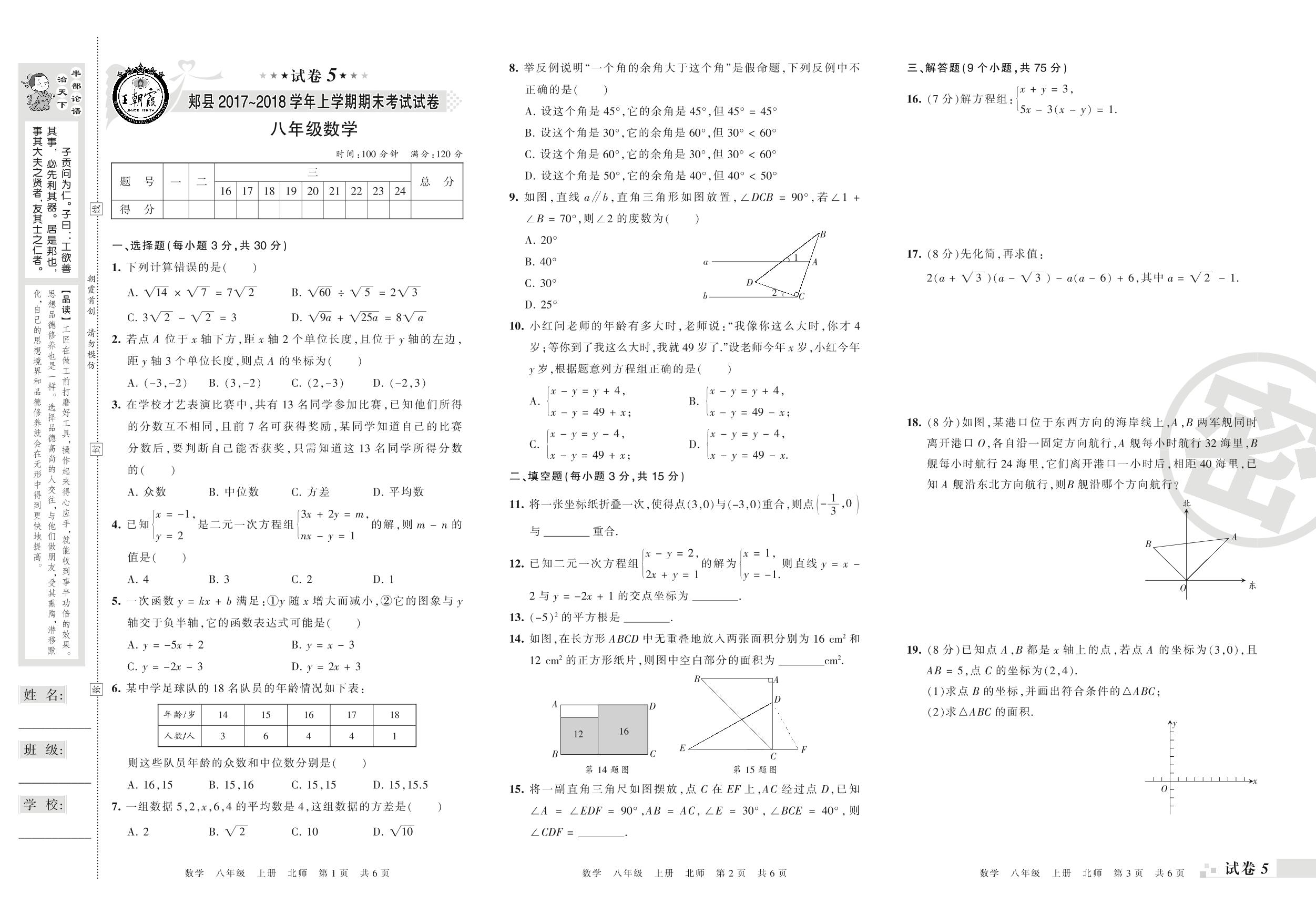 2017-2018学年第一学期郏县八年级数学试卷(北师版)【5】
