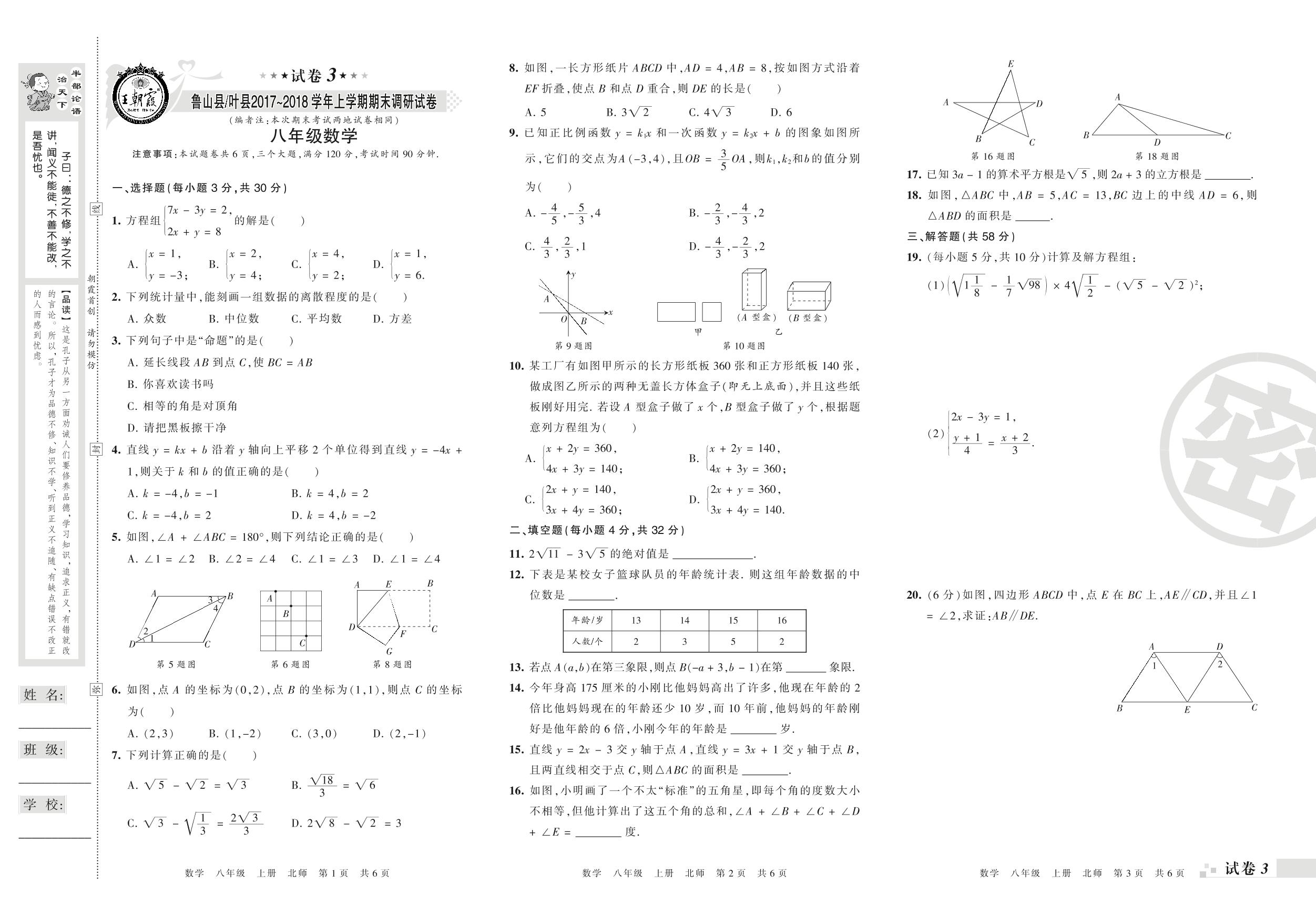 2017-2018学年第一学期鲁山县、叶县八年级数学试卷(北师版)【3】