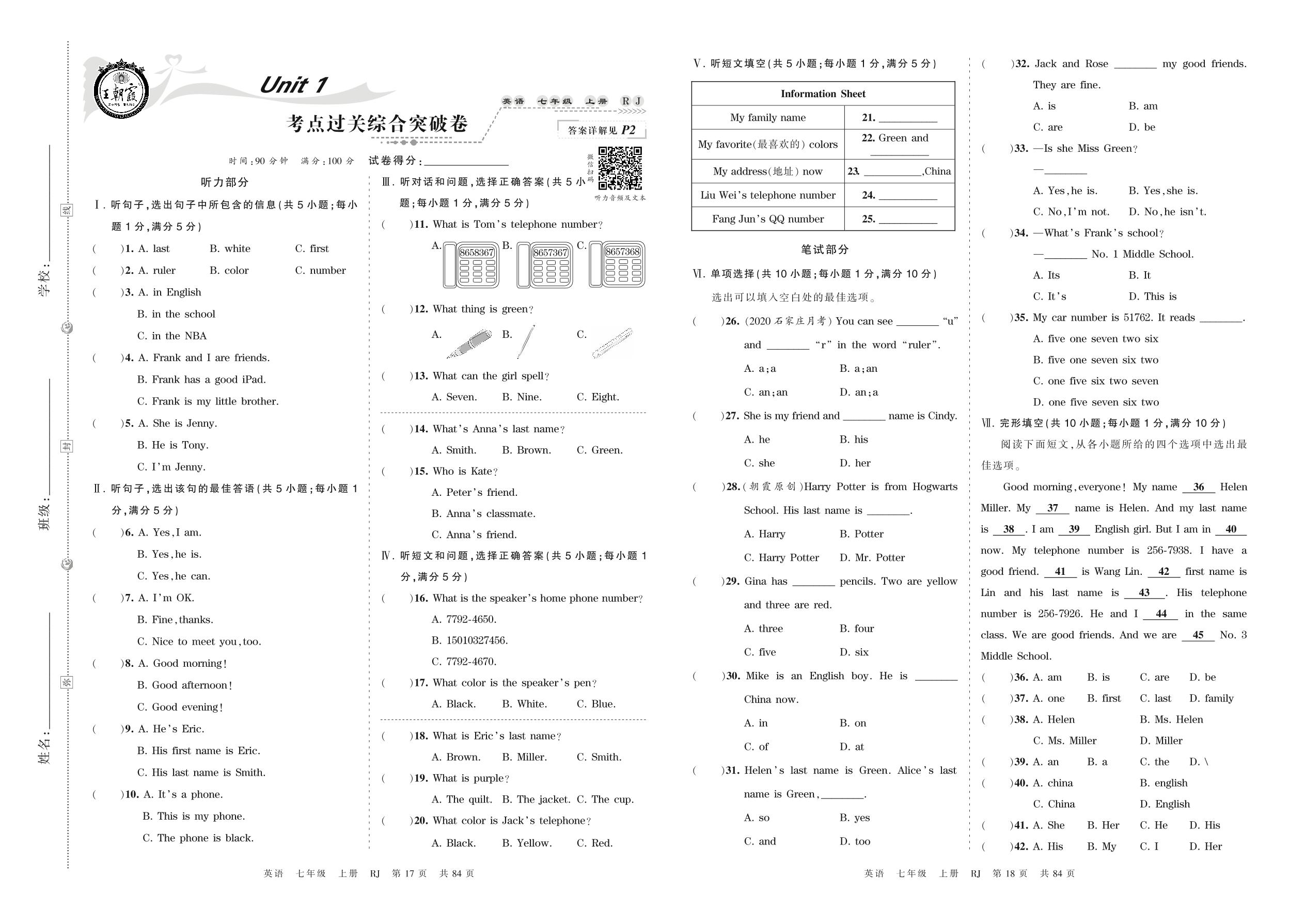 2021上册七年级英语人教版 Unit 1 考点过关综合突破卷