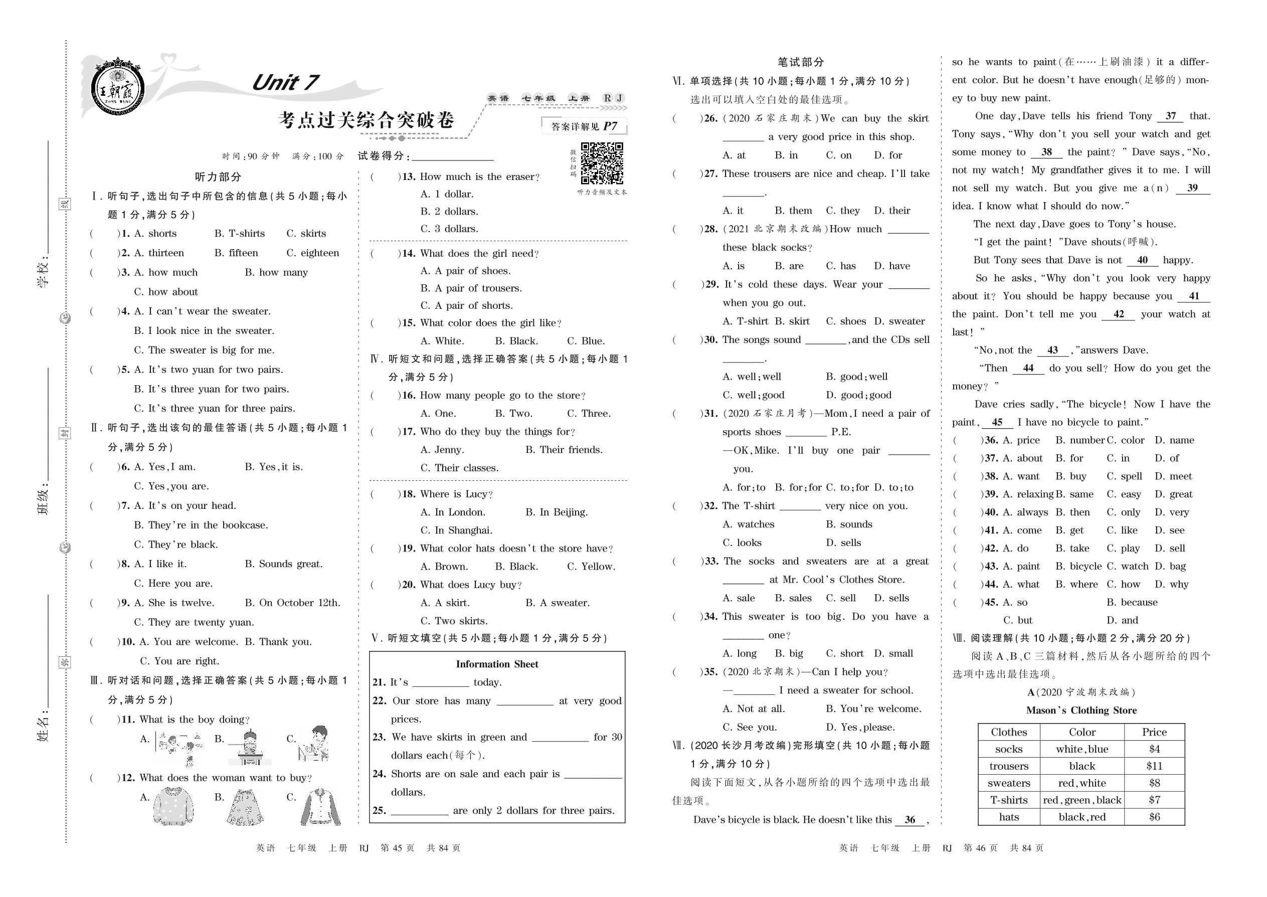 2021上册七年级英语人教版 Unit 7 考点过关综合突破卷