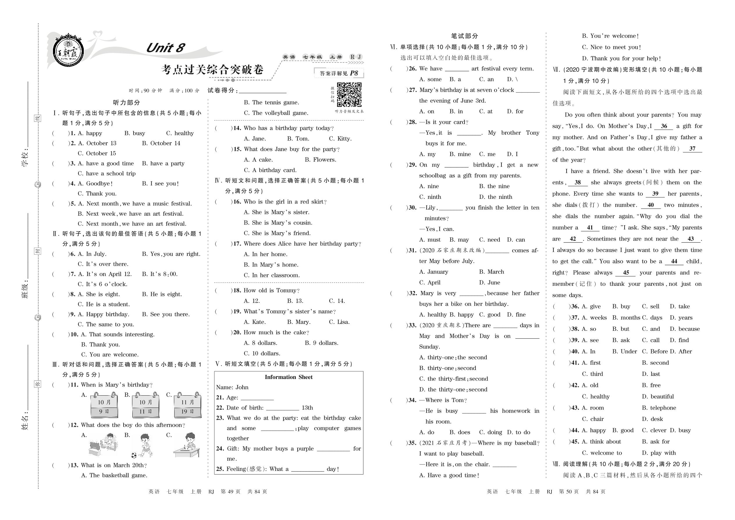 2021上册七年级英语人教版 Unit 8 考点过关综合突破卷