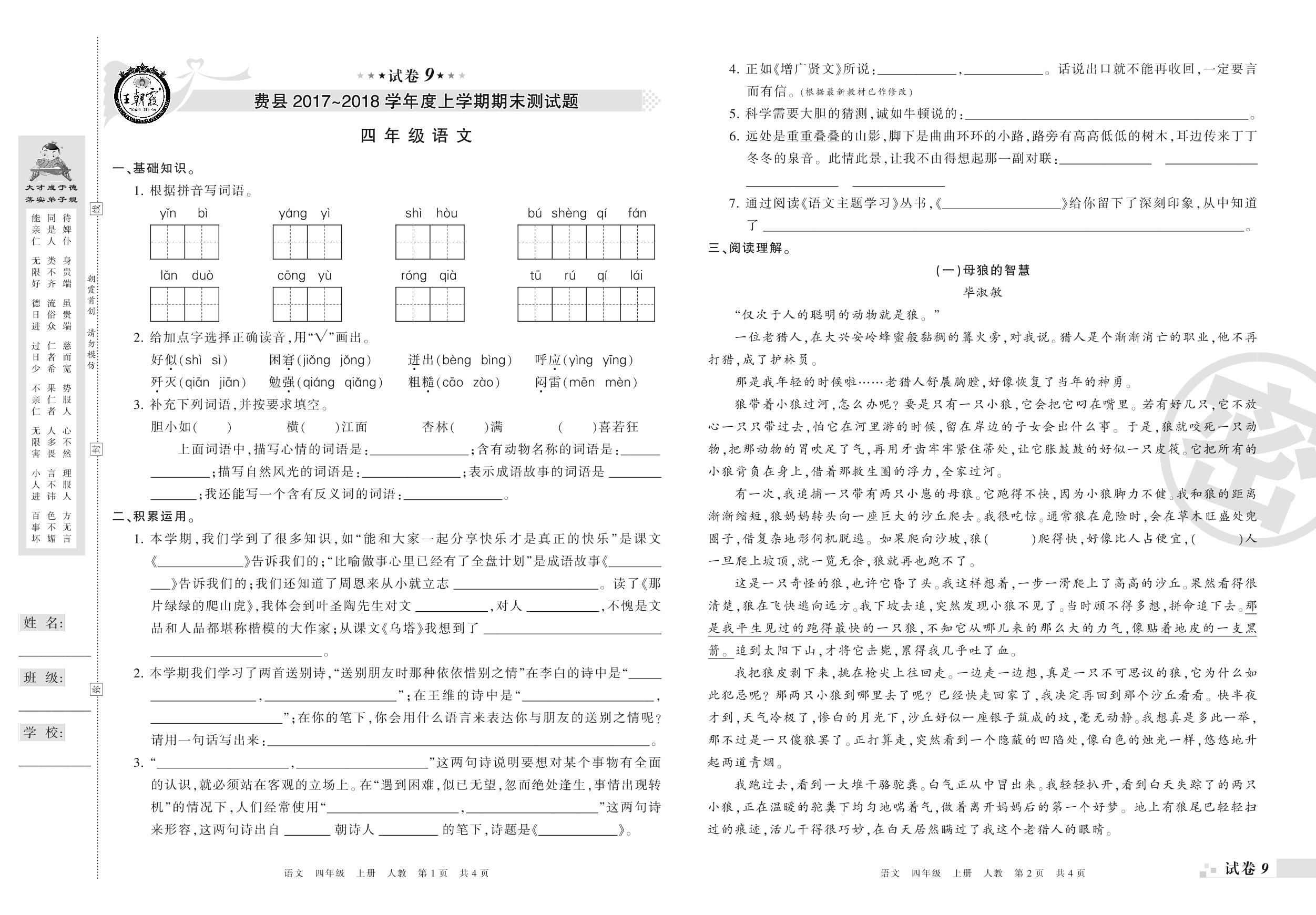 2017-2018学年第一学期临沂市费县四年级语文试卷(人教版)【9】