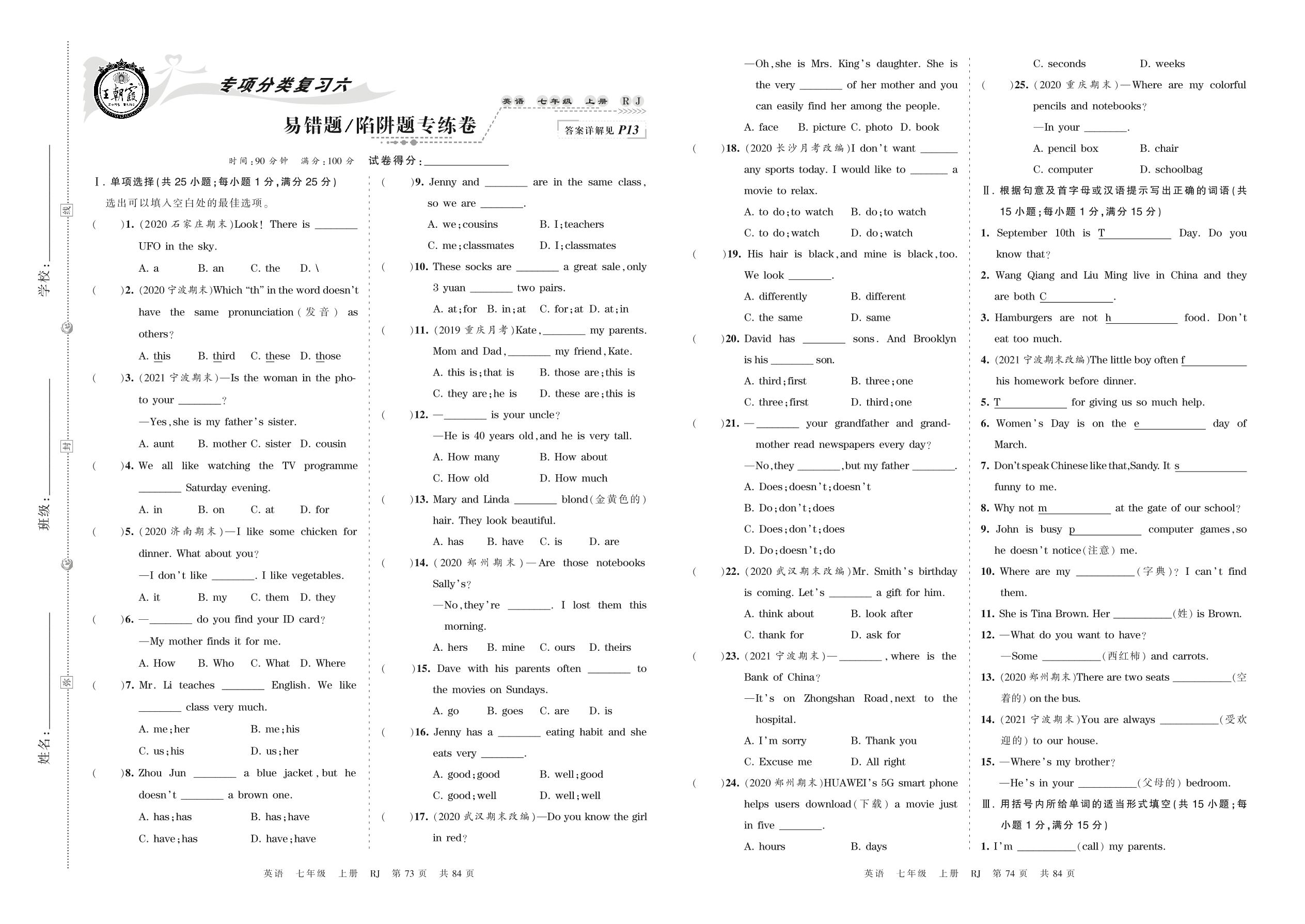 2021上册七年级英语人教版 易错题、陷阱题专练卷