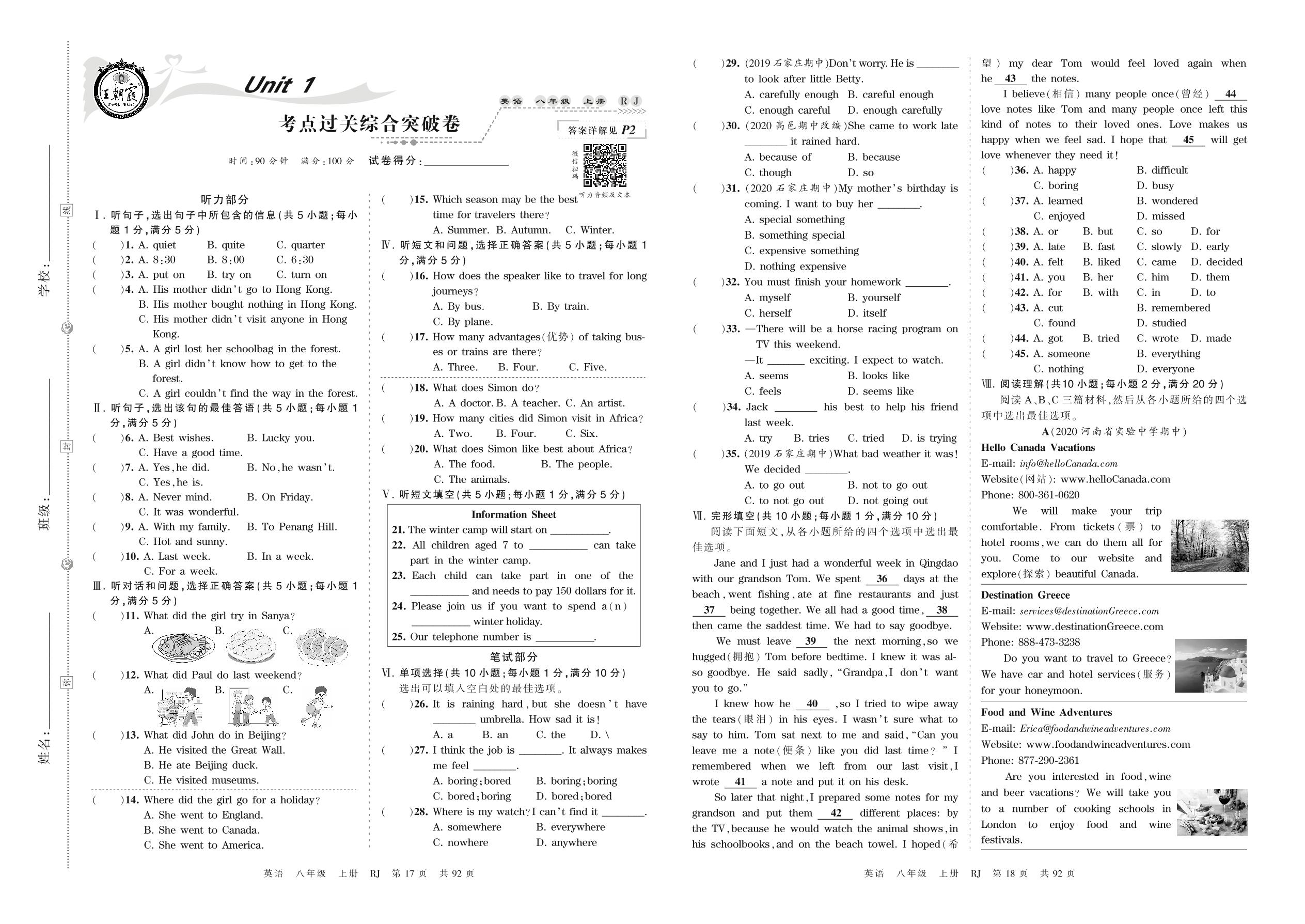 八年级英语人教版上册单元卷