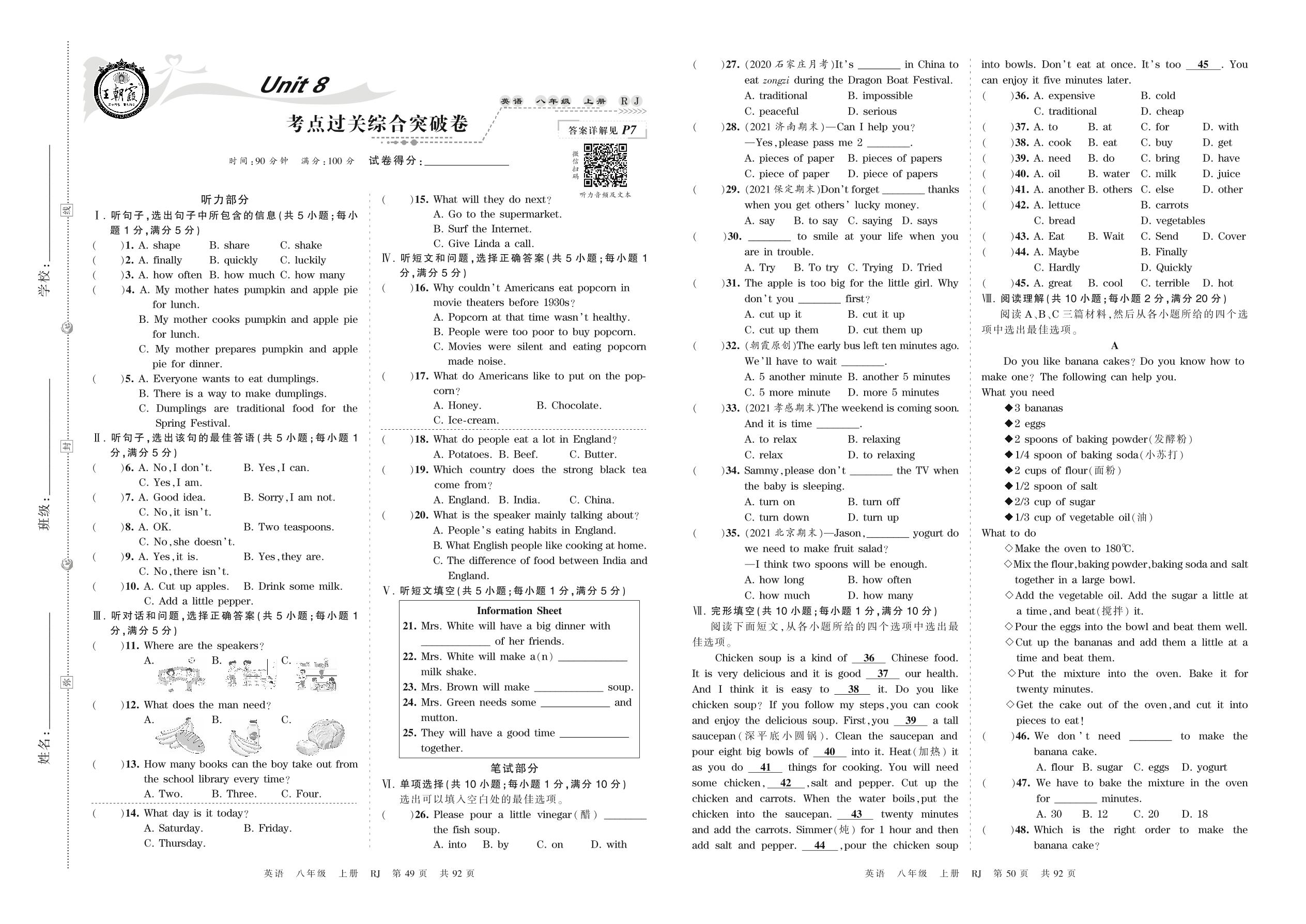 2021上册八年级英语人教版 Unit 8 考点过关综合突破卷