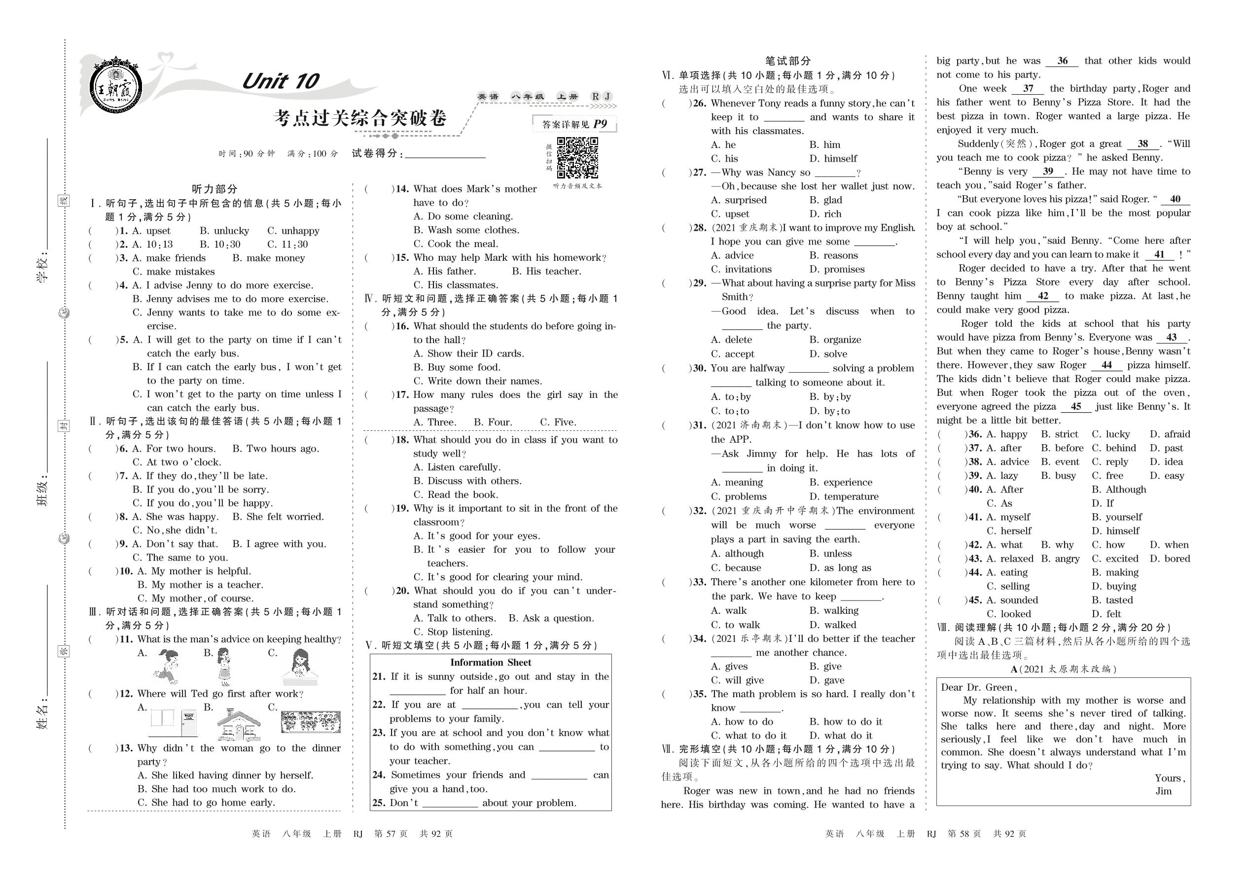 2021上册八年级英语人教版 Unit 10 考点过关综合突破卷