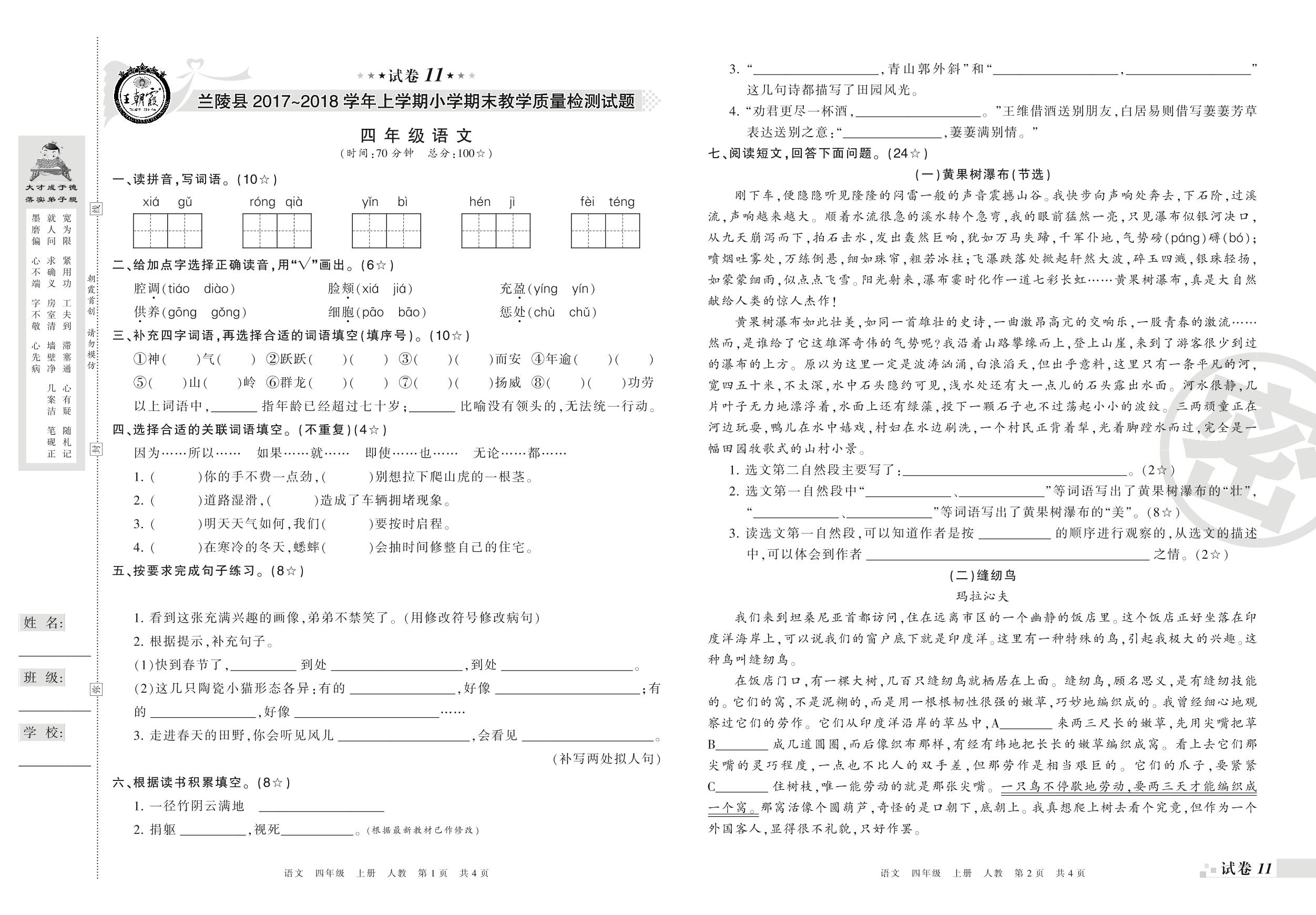 2017-2018学年第一学期临沂市兰陵县四年级语文试卷(人教版)【11】