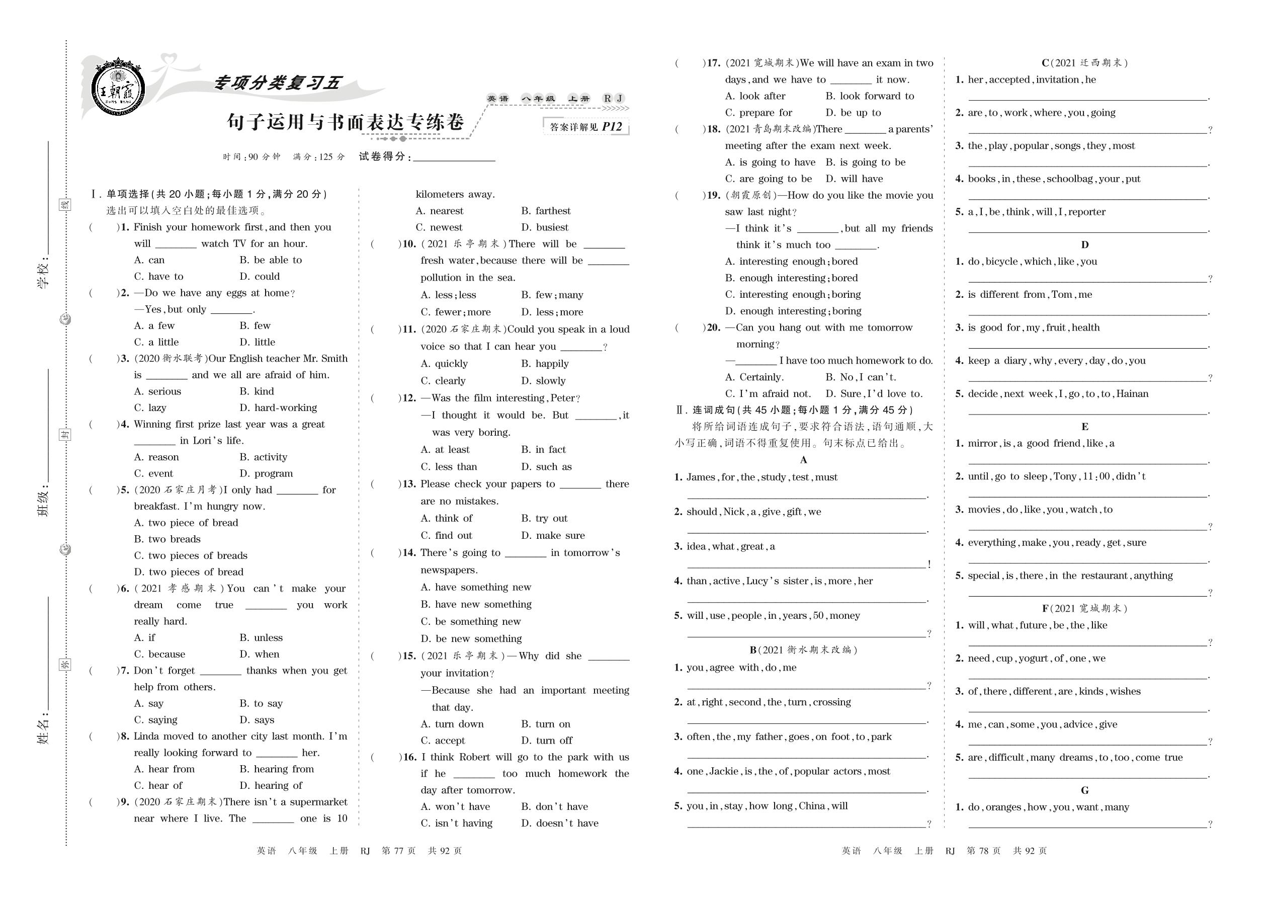 2021上册八年级英语人教版 句子运用与书面表达专练卷