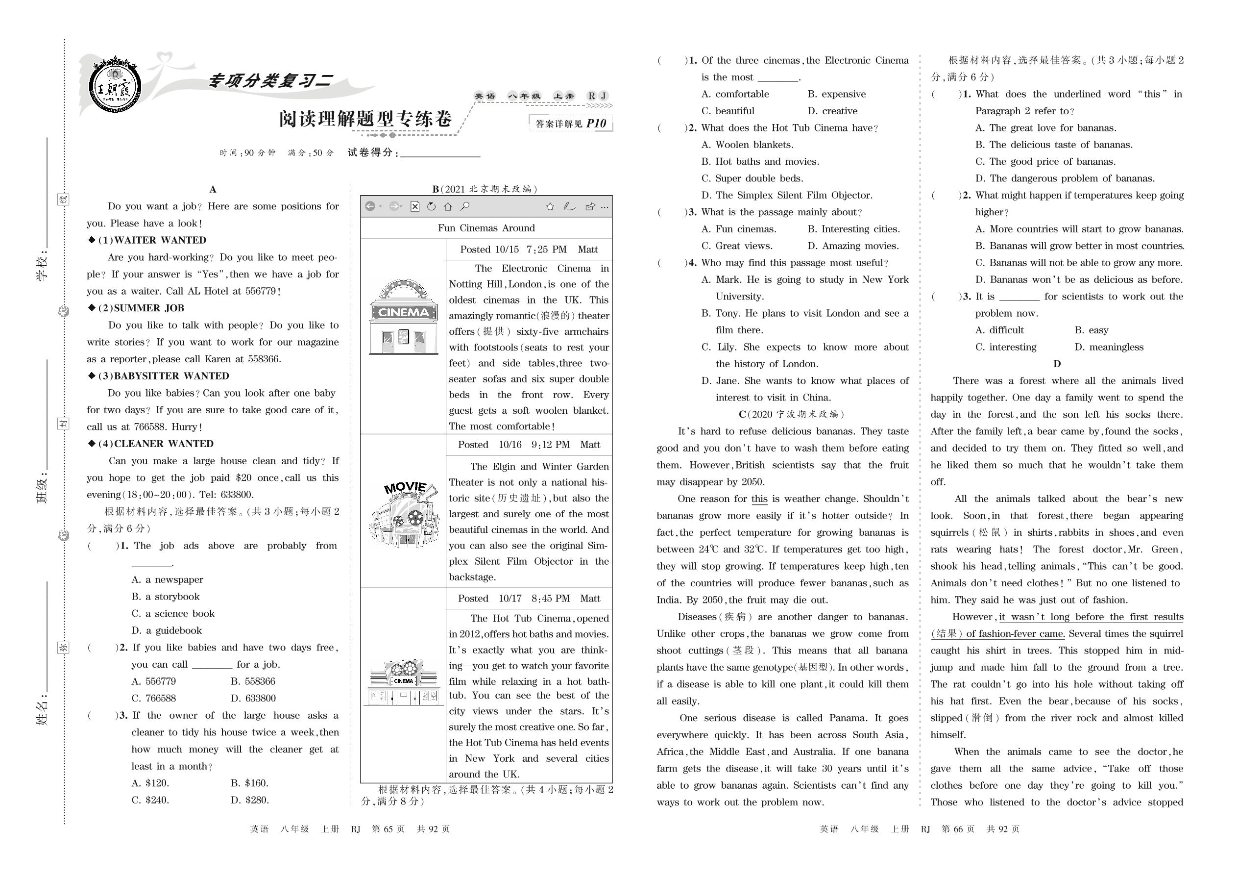 2021上册八年级英语人教版 阅读理解题型专练卷