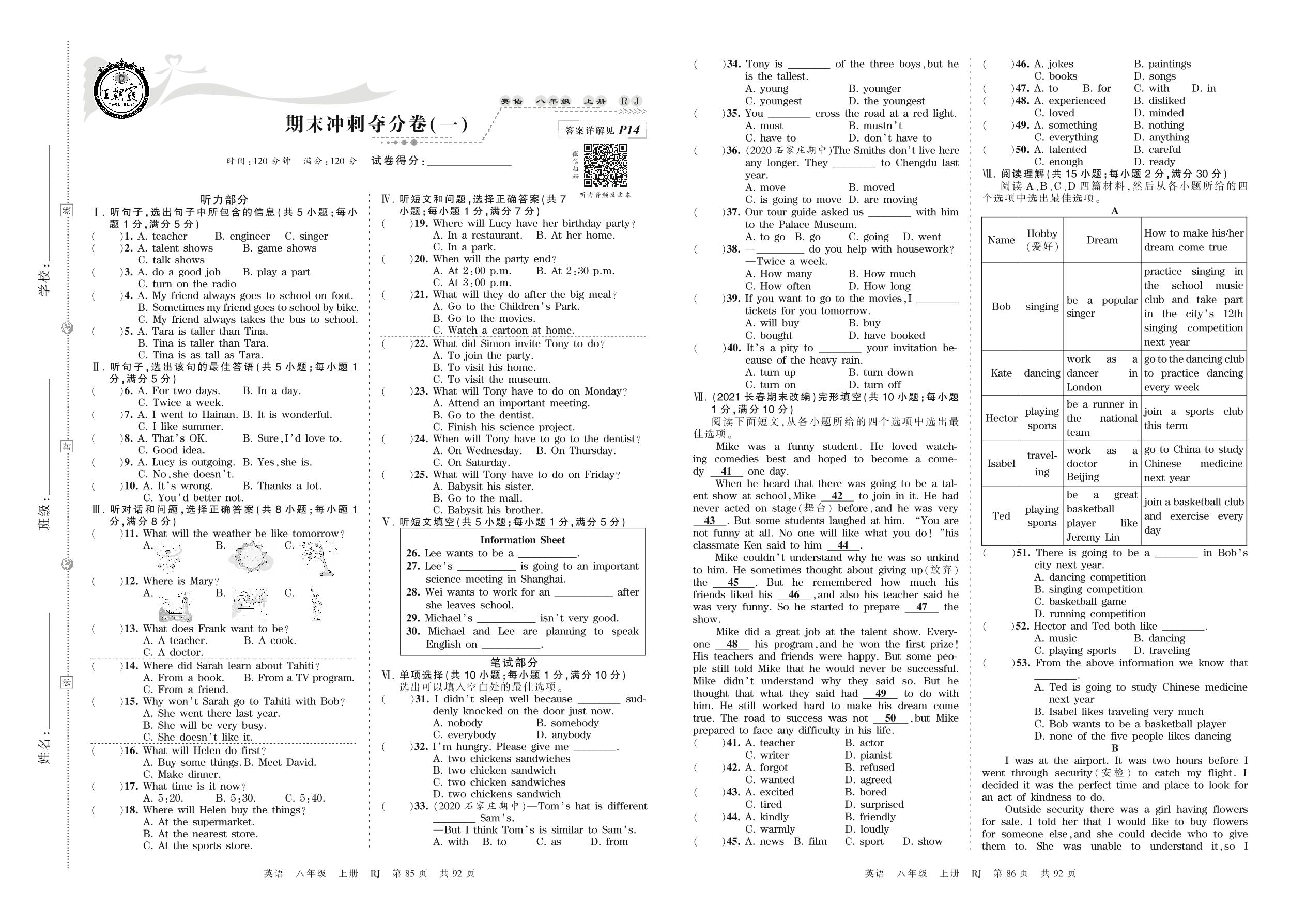 2021上册八年级英语人教版 期末冲刺夺分卷(一)