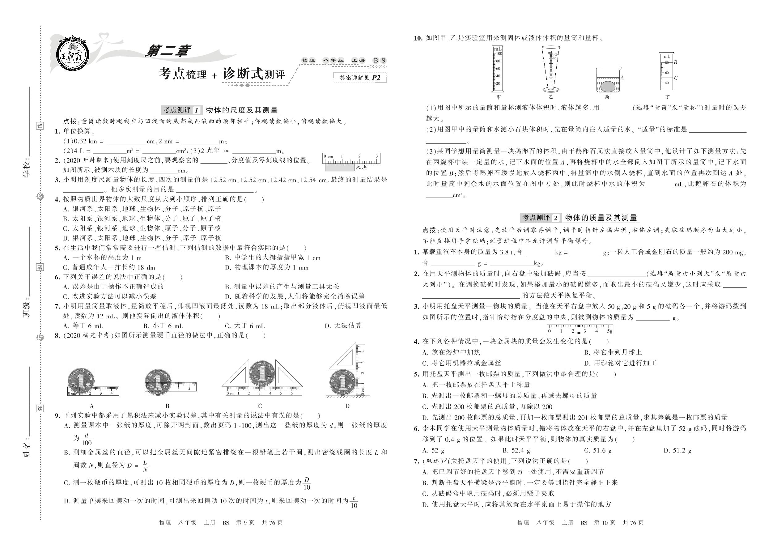 2021上册八年级物理北师版 第二章 考点梳理 + 诊断式测评