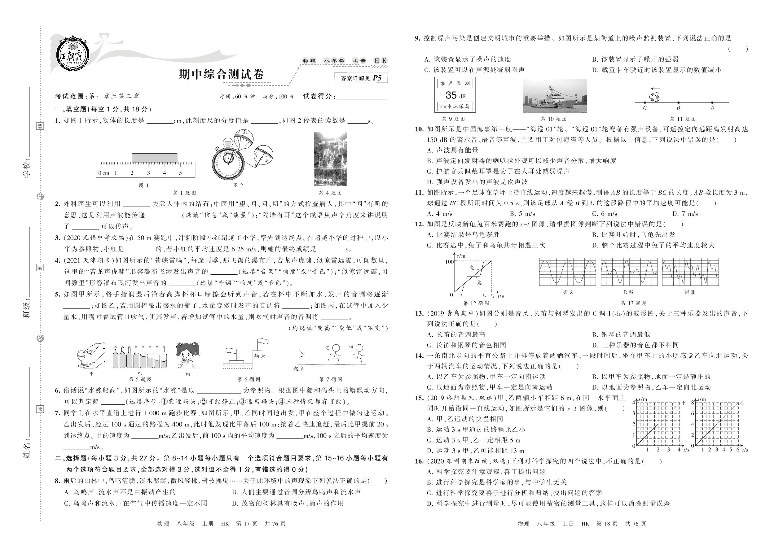 2021-2022学年第一学期八年级物理沪科版 期中综合测试卷
