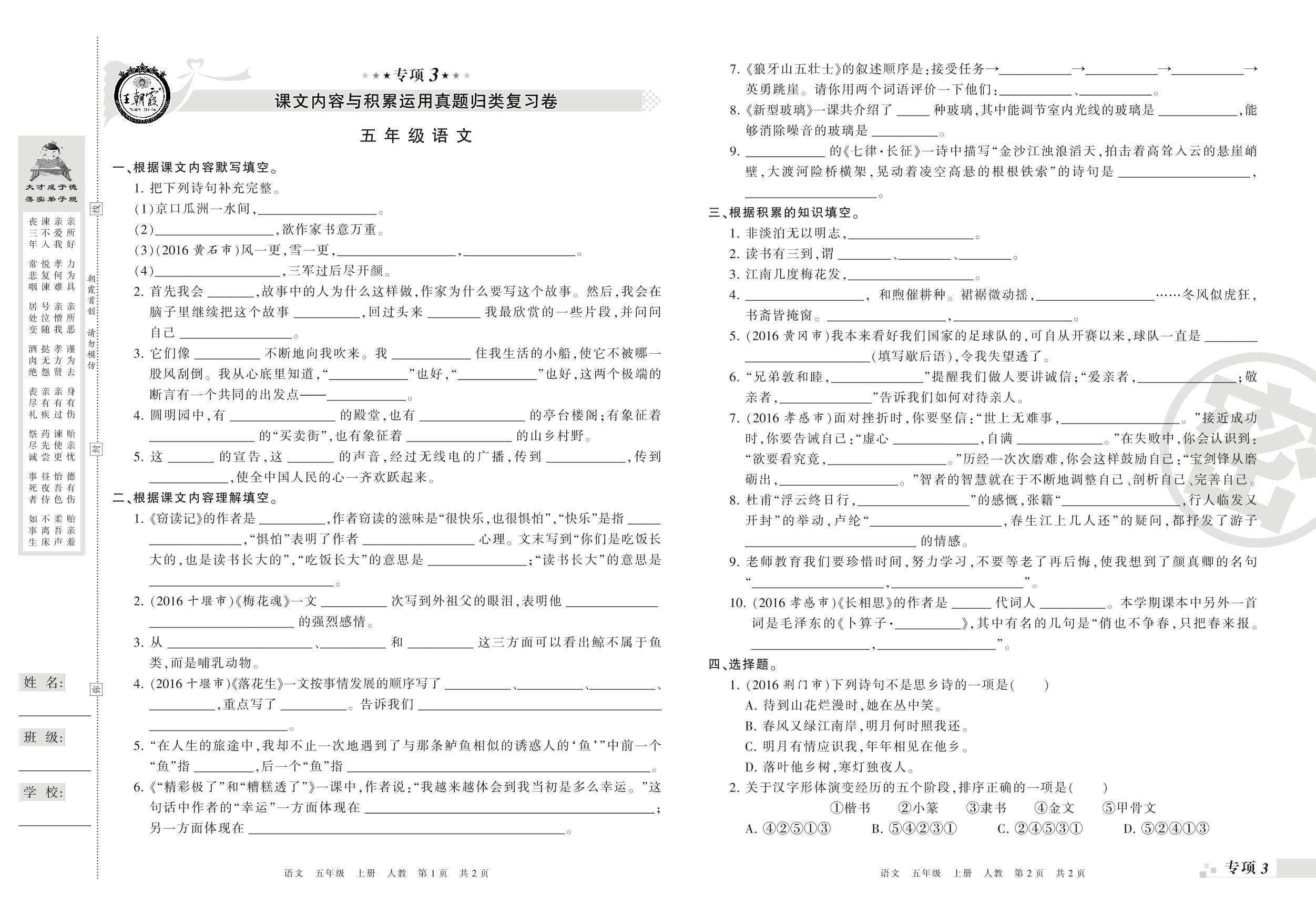 王朝霞期末专项卷——课文内容与积累运用、课内阅读与写作真题归类复习五年级上册语文(人教版)【0】