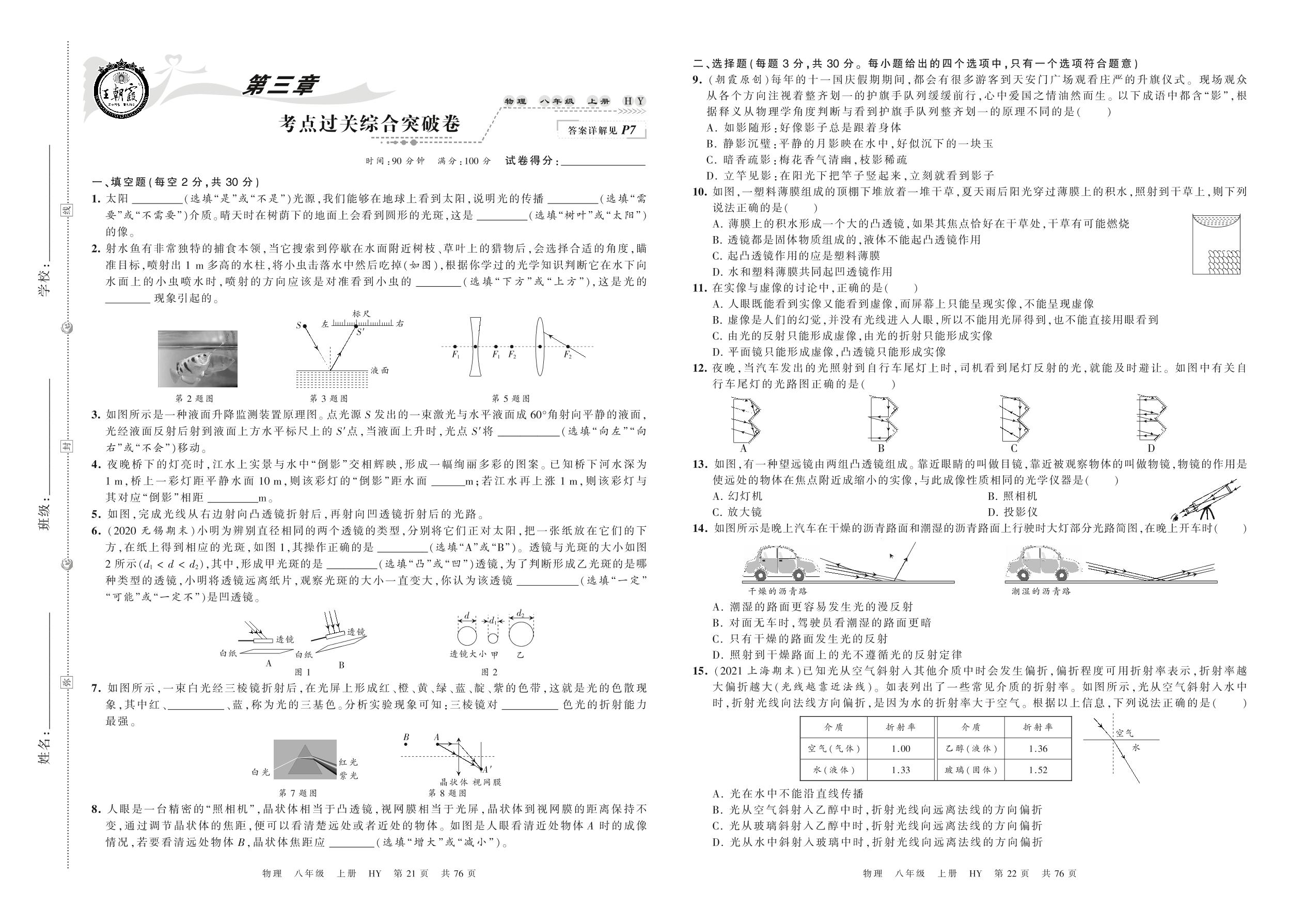 2021上册八年级物理沪粤版 第三章 考点过关综合突破卷