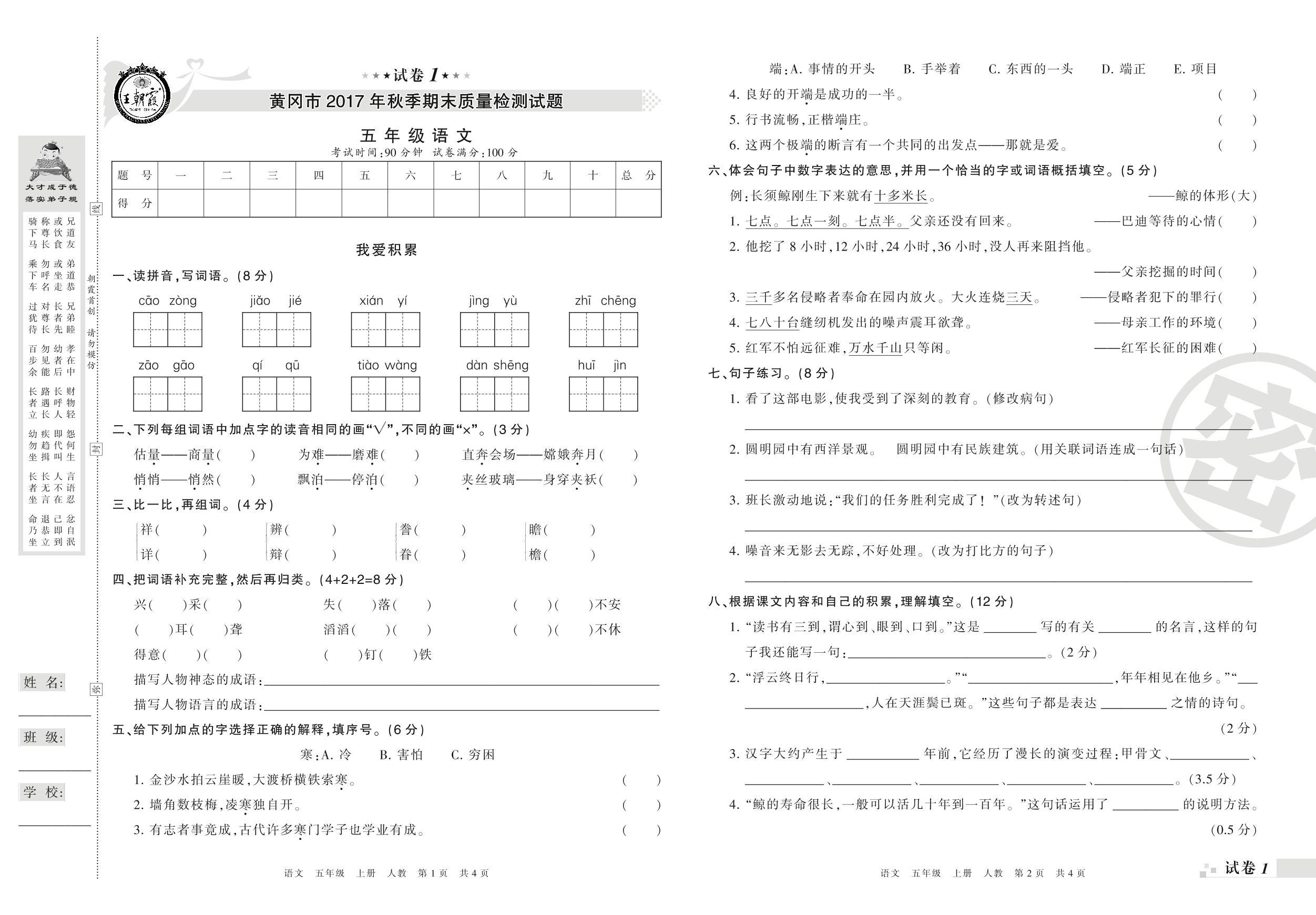 2017-2018学年第一学期黄冈市五年级语文试卷(人教版)【1】
