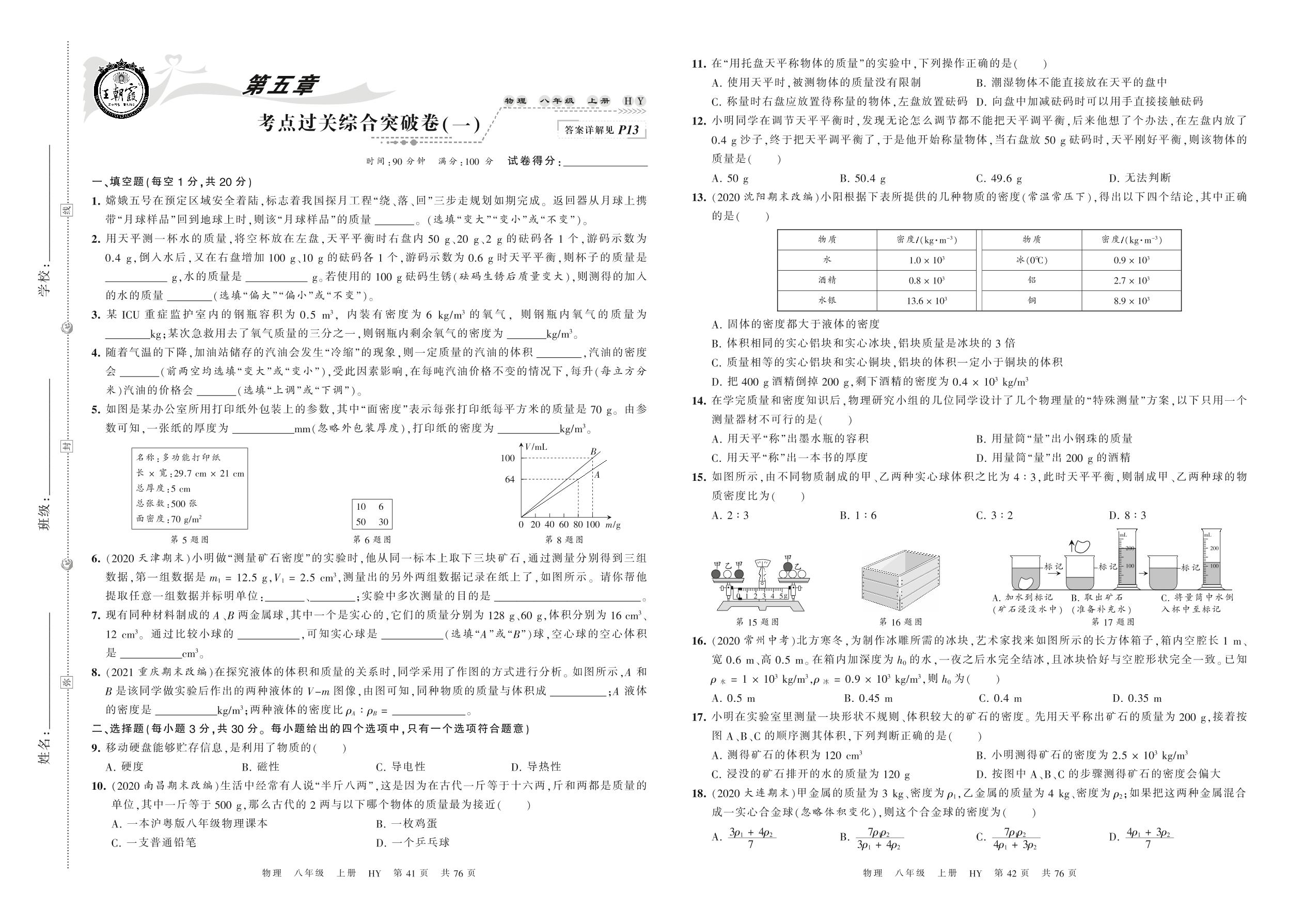 2021上册八年级物理沪粤版 第五章 考点过关综合突破卷(一)