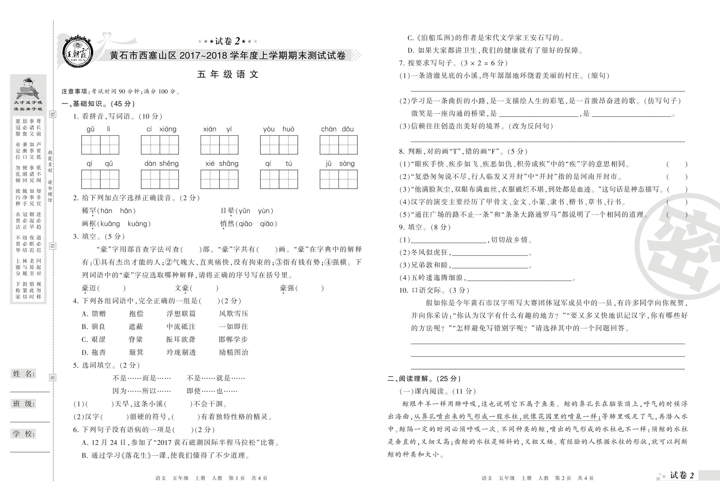 2017-2018学年第一学期黄石市西塞山区五年级语文试卷(人教版)【2】
