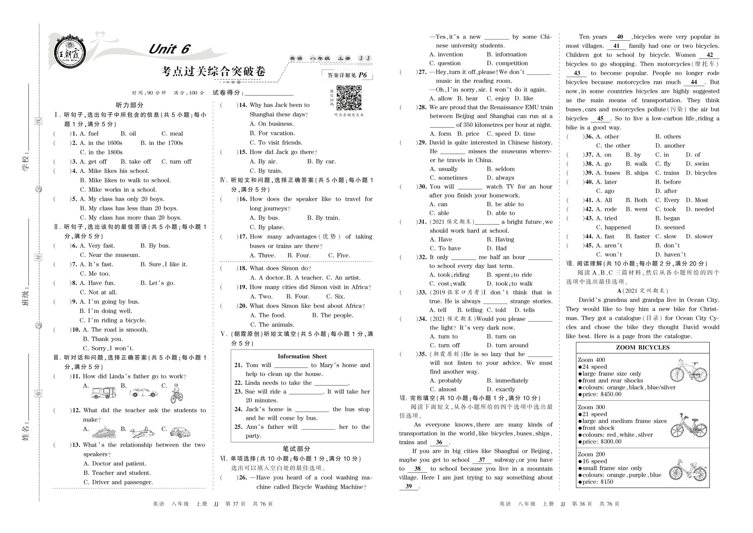 2021上册八年级英语冀教版 Unit 6 考点过关综合突破卷