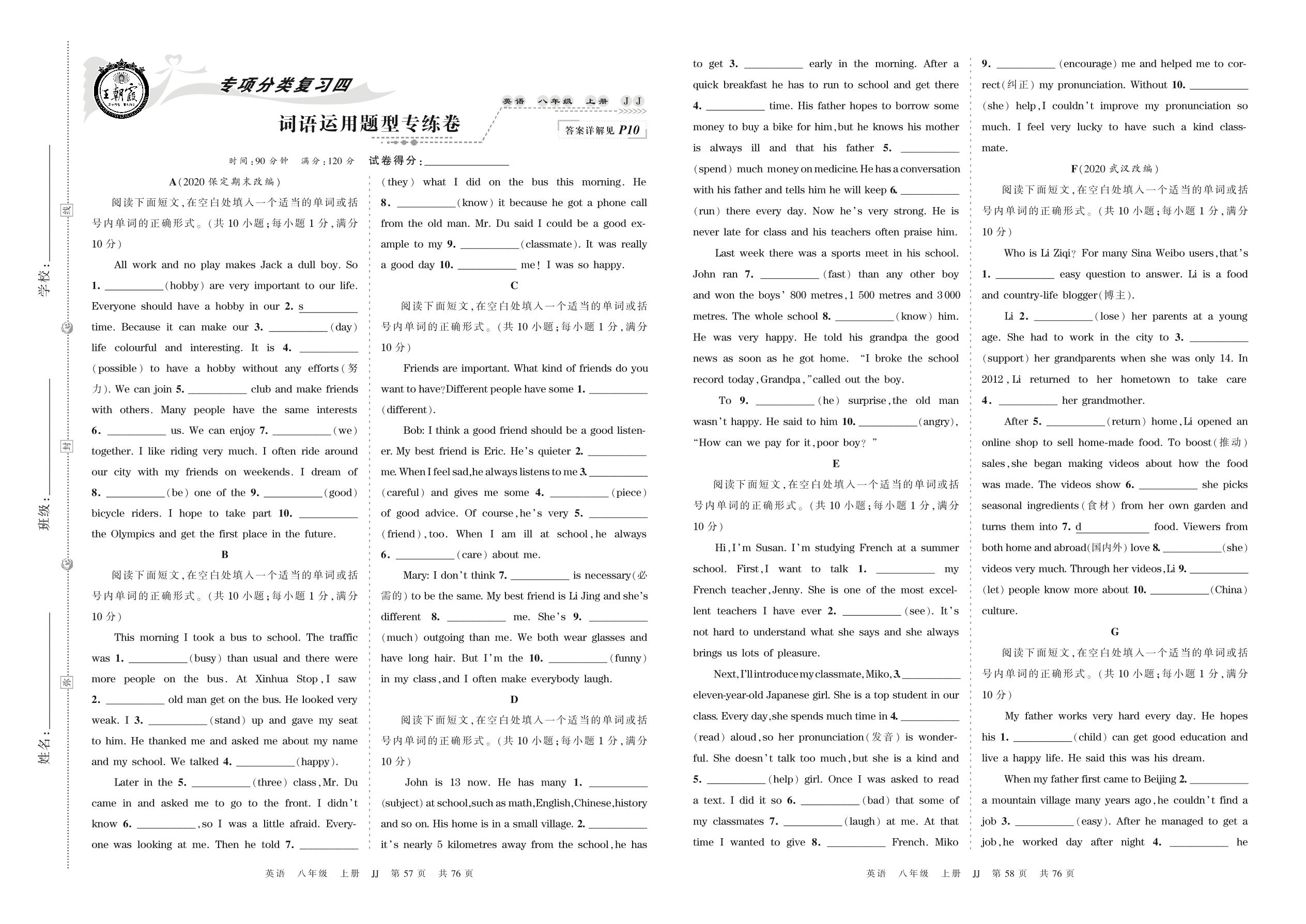 2021上册八年级英语冀教版 词语运用题型专练卷