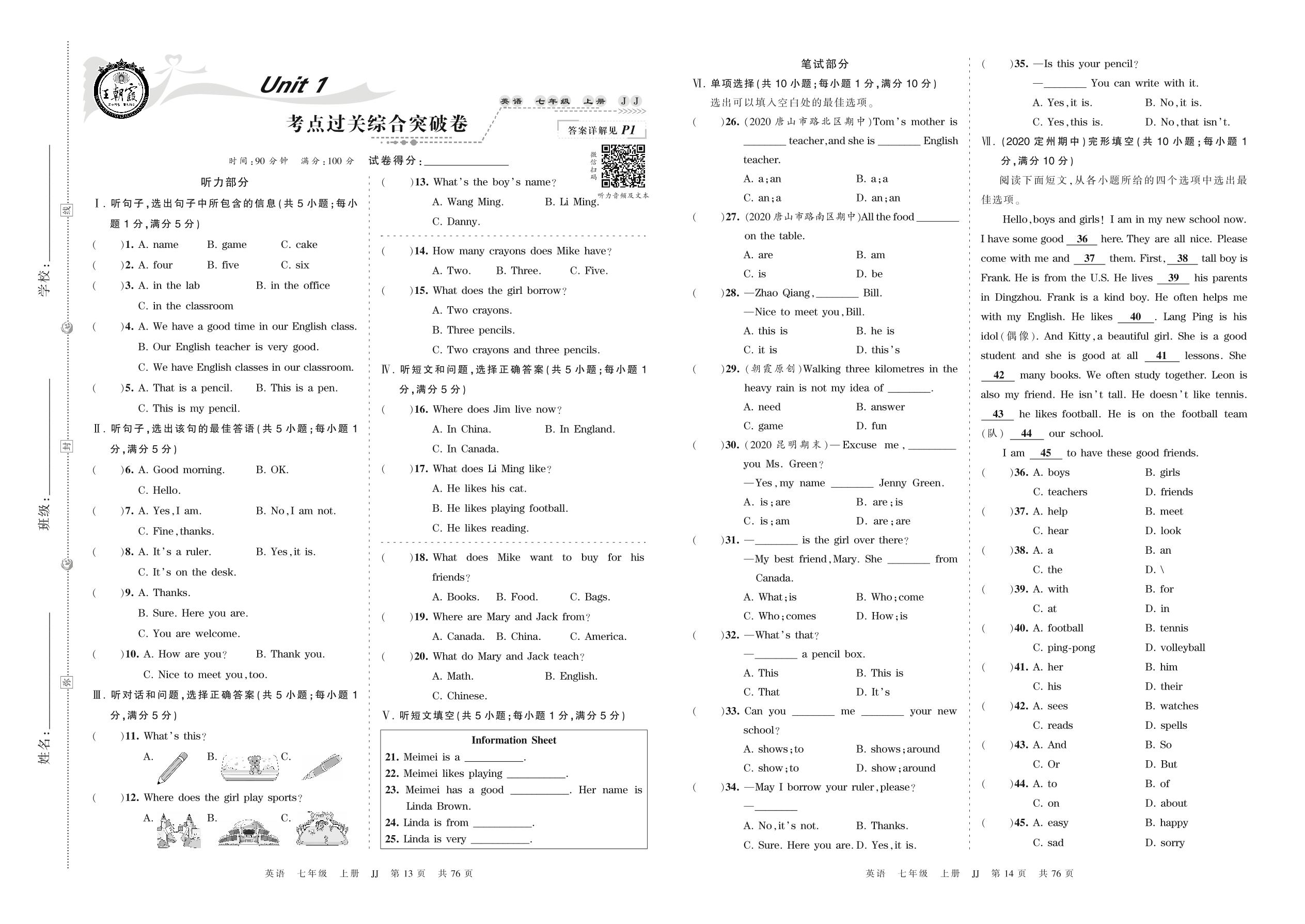 2021上册七年级英语冀教版 Unit 1 考点过关综合突破卷