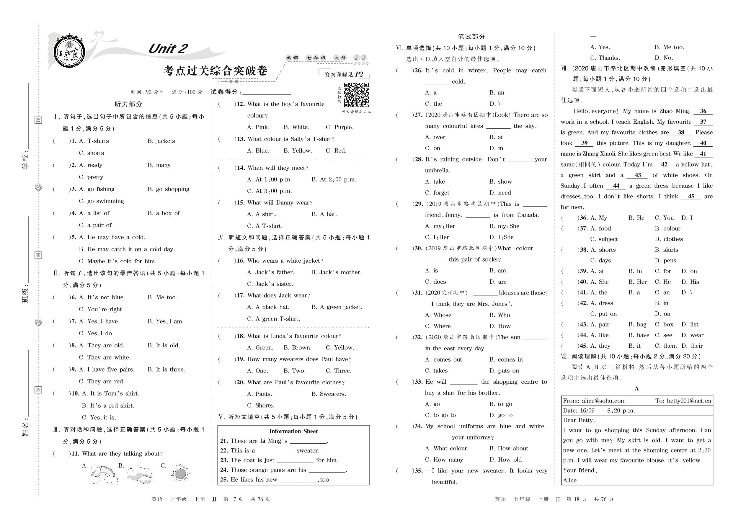 七年级英语冀教版上册单元卷