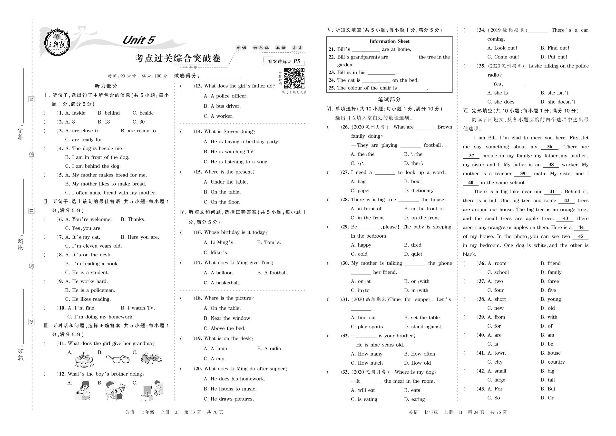 2021上册七年级英语冀教版 Unit 5 考点过关综合突破卷