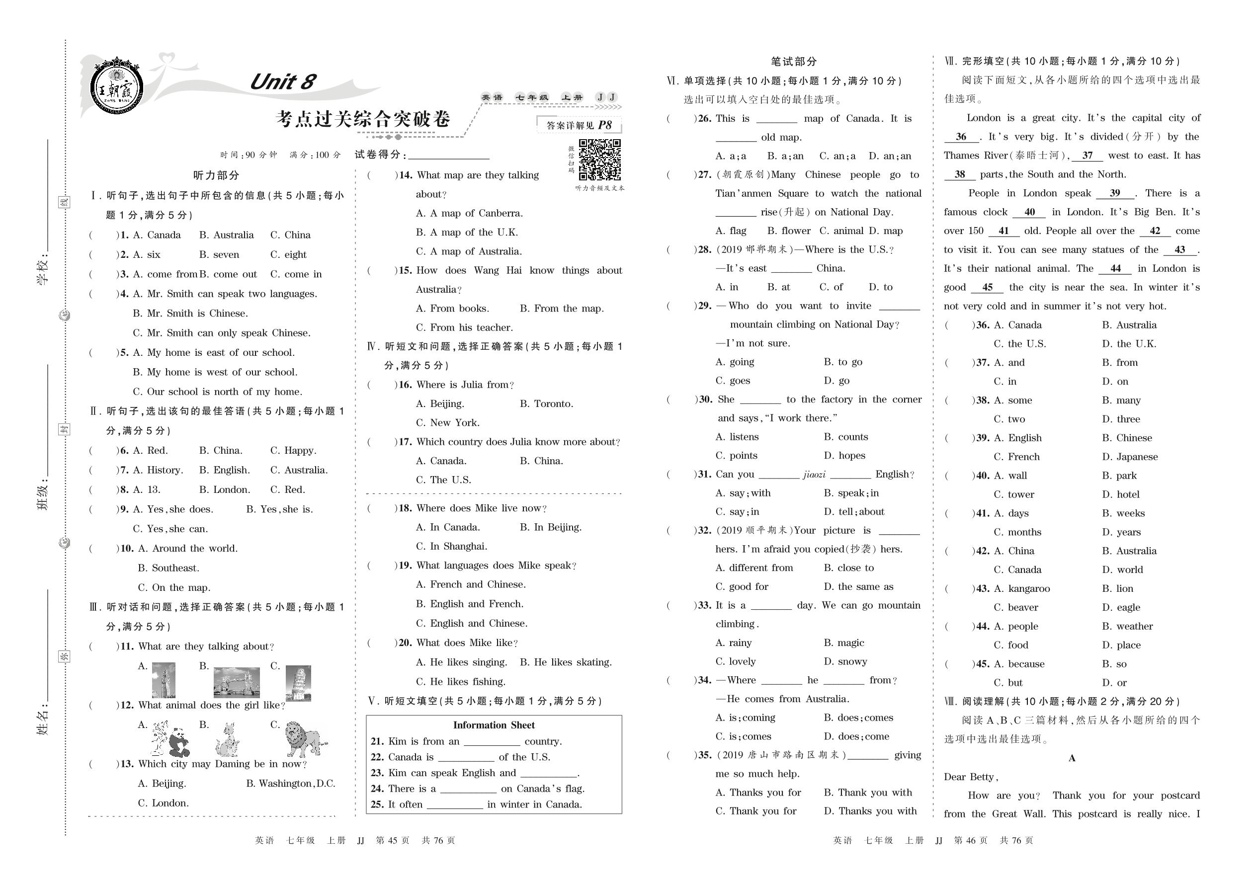 2021上册七年级英语冀教版 Unit 8 考点过关综合突破卷