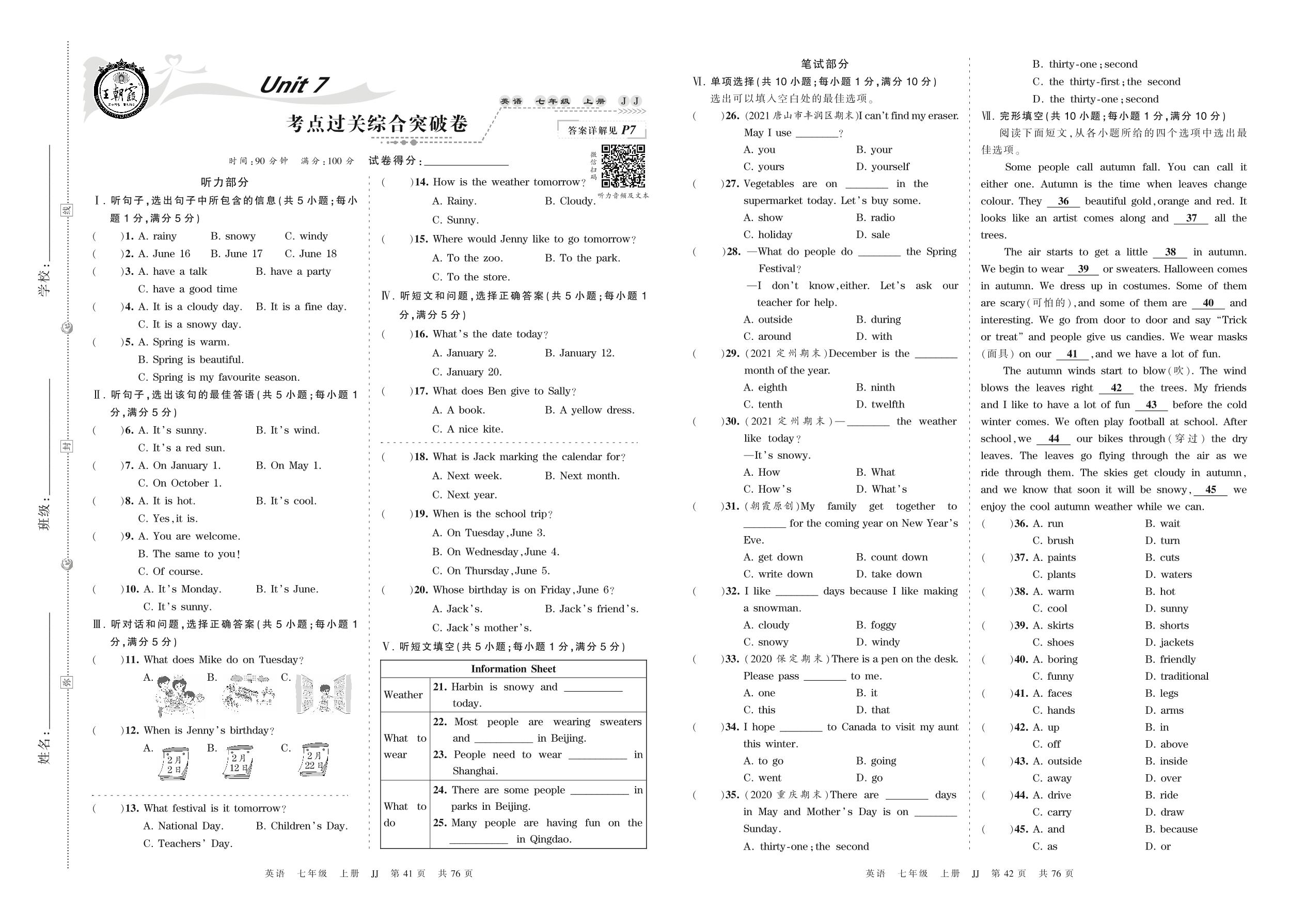 2021上册七年级英语冀教版 Unit 7 考点过关综合突破卷