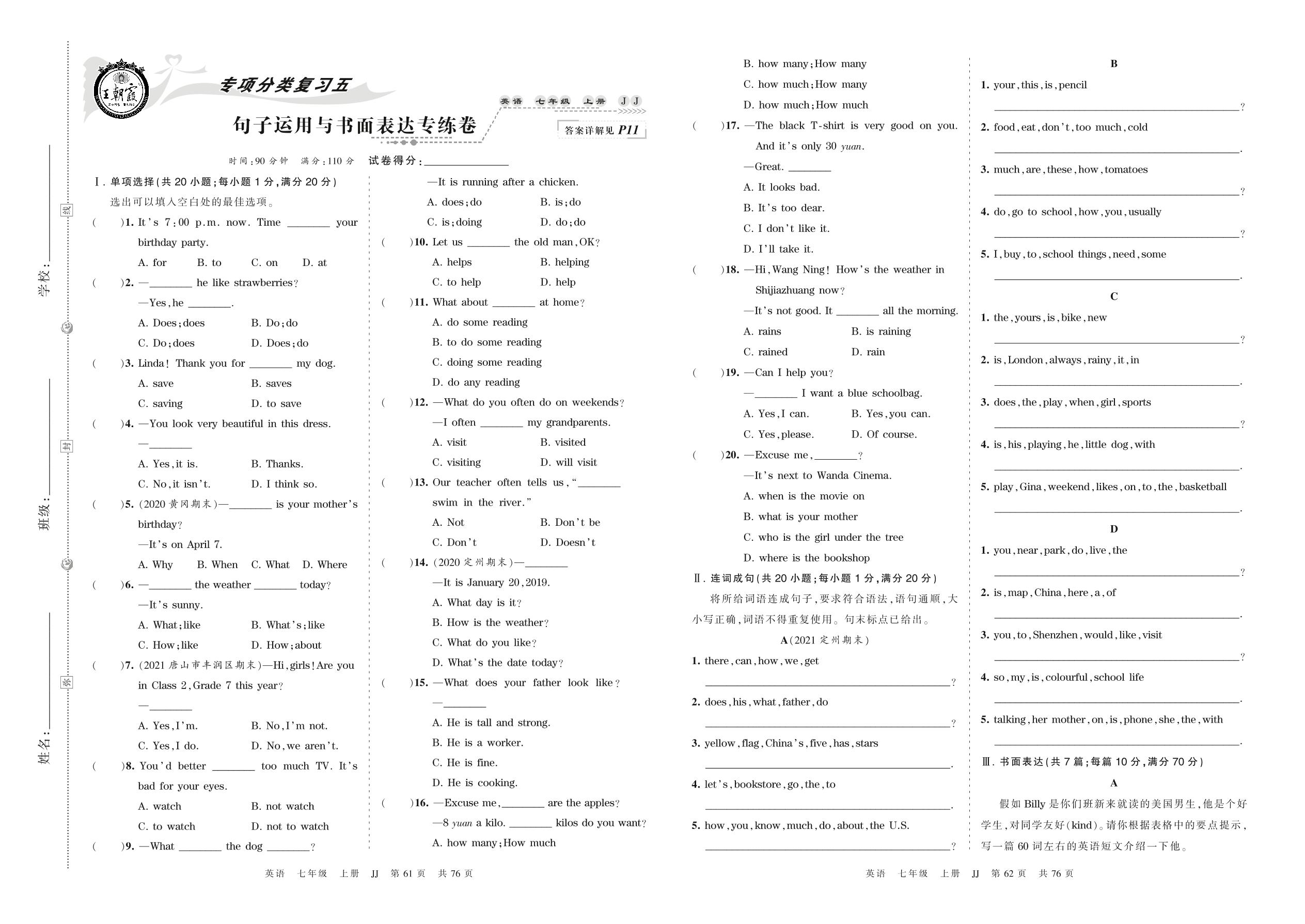 2021上册七年级英语冀教版 句子运用与书面表达专练卷