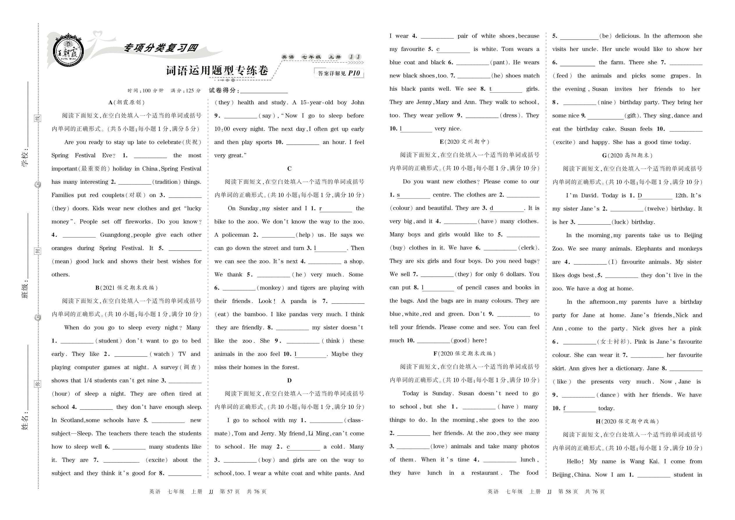 2021上册七年级英语冀教版 词语运用题型专练卷