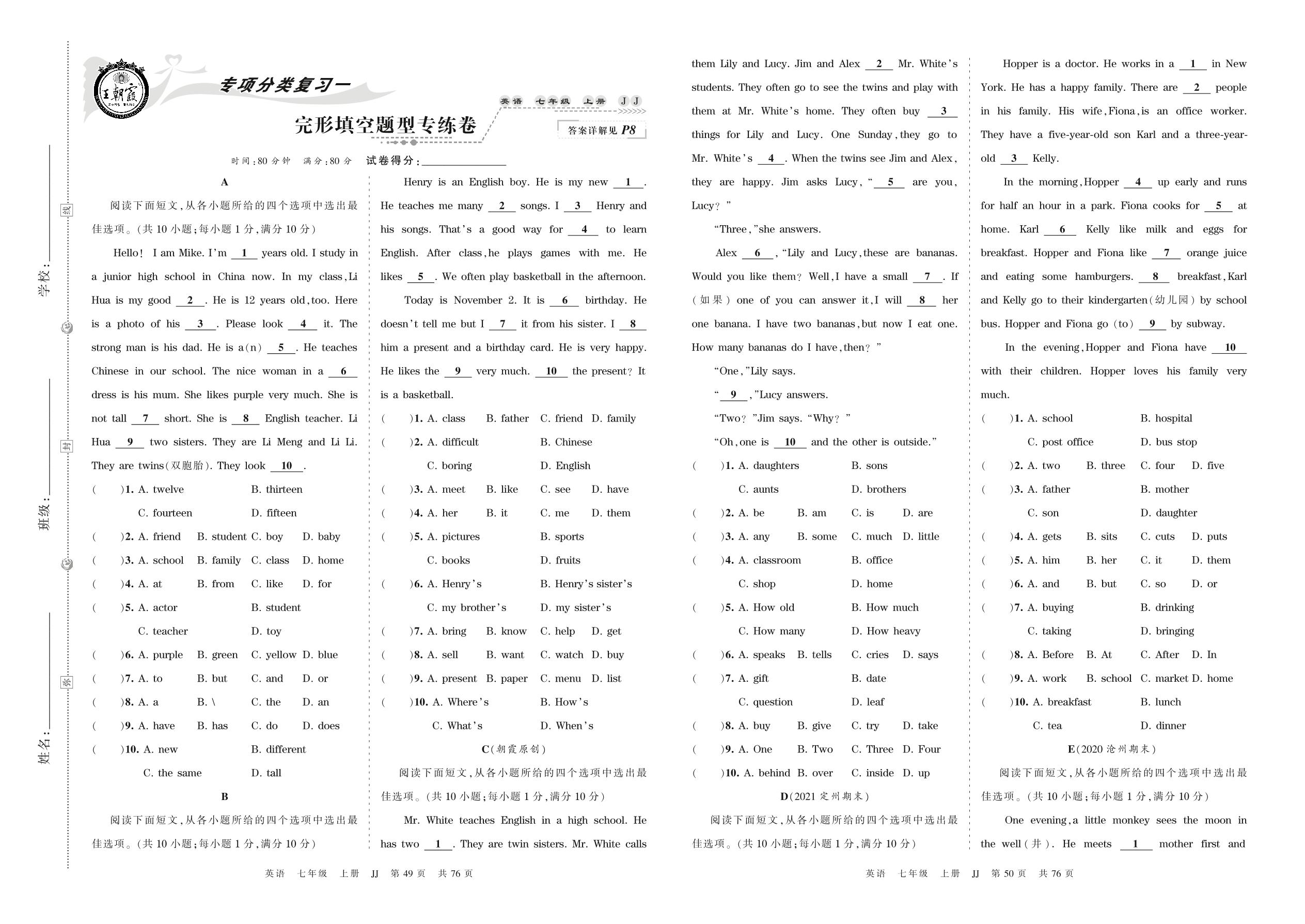 2021上册七年级英语冀教版 完形填空题型专练卷