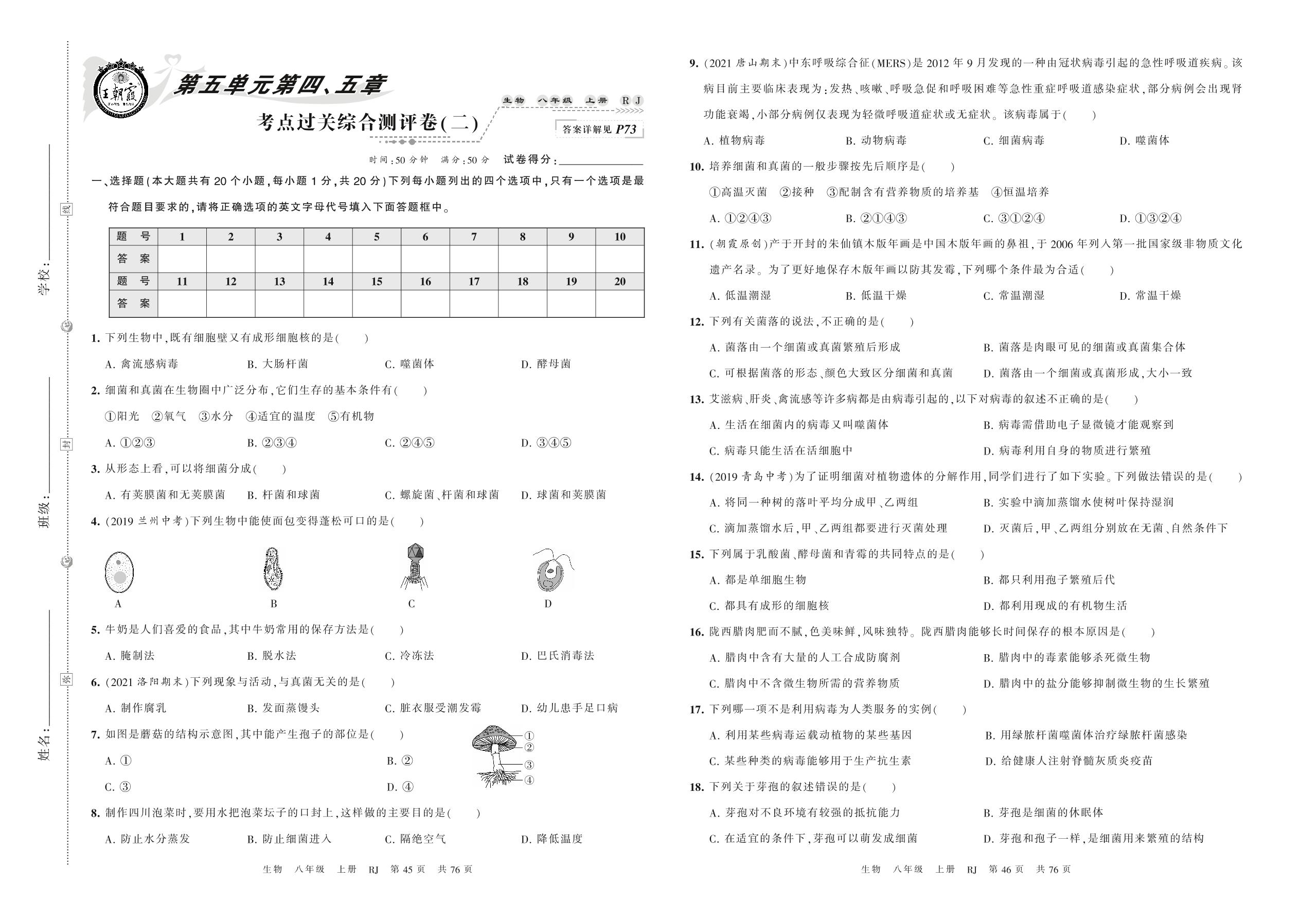 2021上册八年级生物人教版 第五单元第四、五章 考点过关综合测评卷(二)