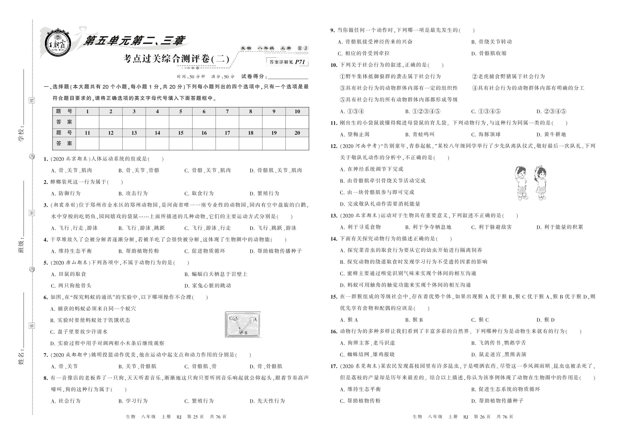 2021上册八年级生物人教版 第五单元第二、三章 考点过关综合测评卷(二)