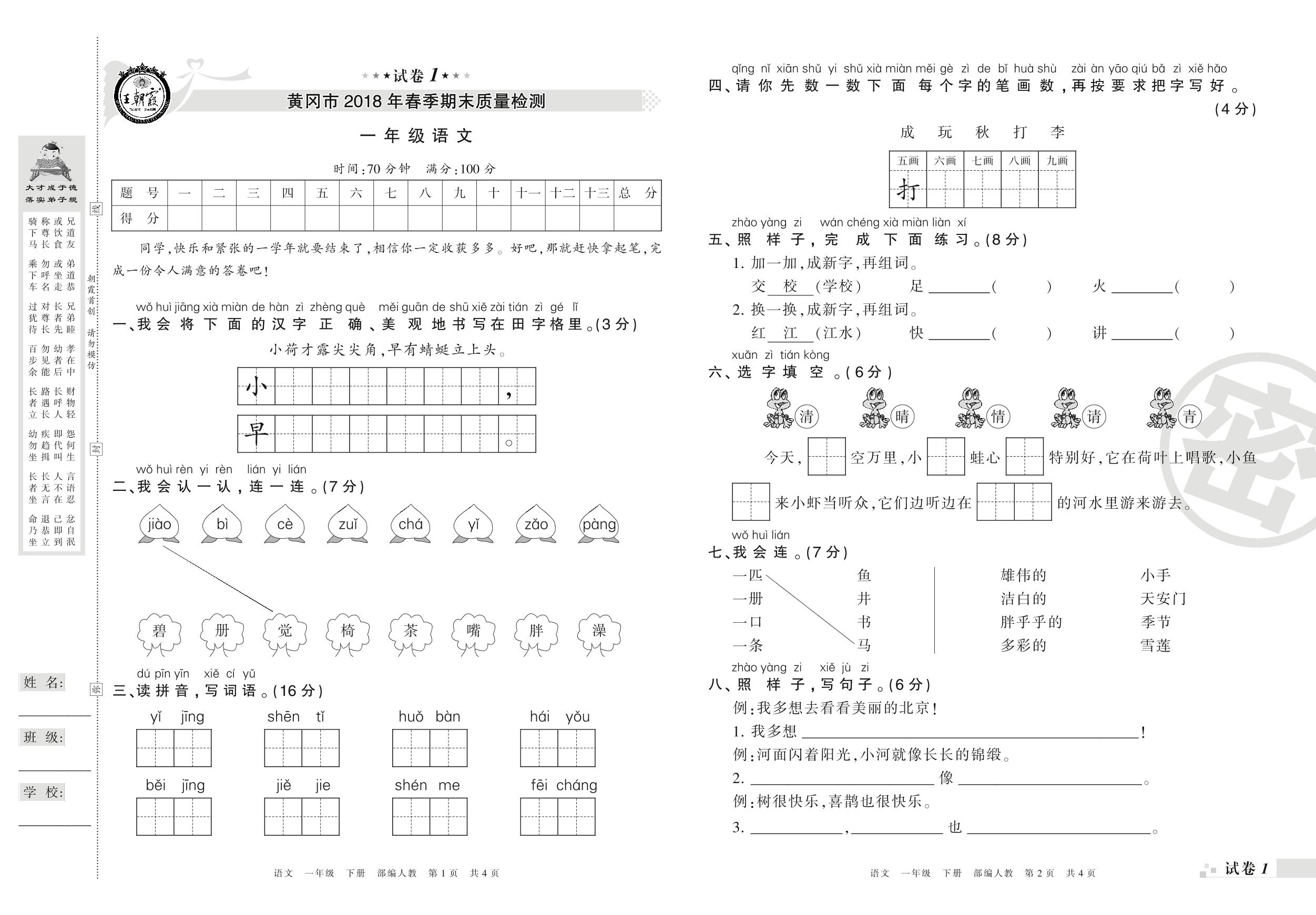 2017-2018学年第二学期黄冈市一年级语文试卷(人教版)【1】