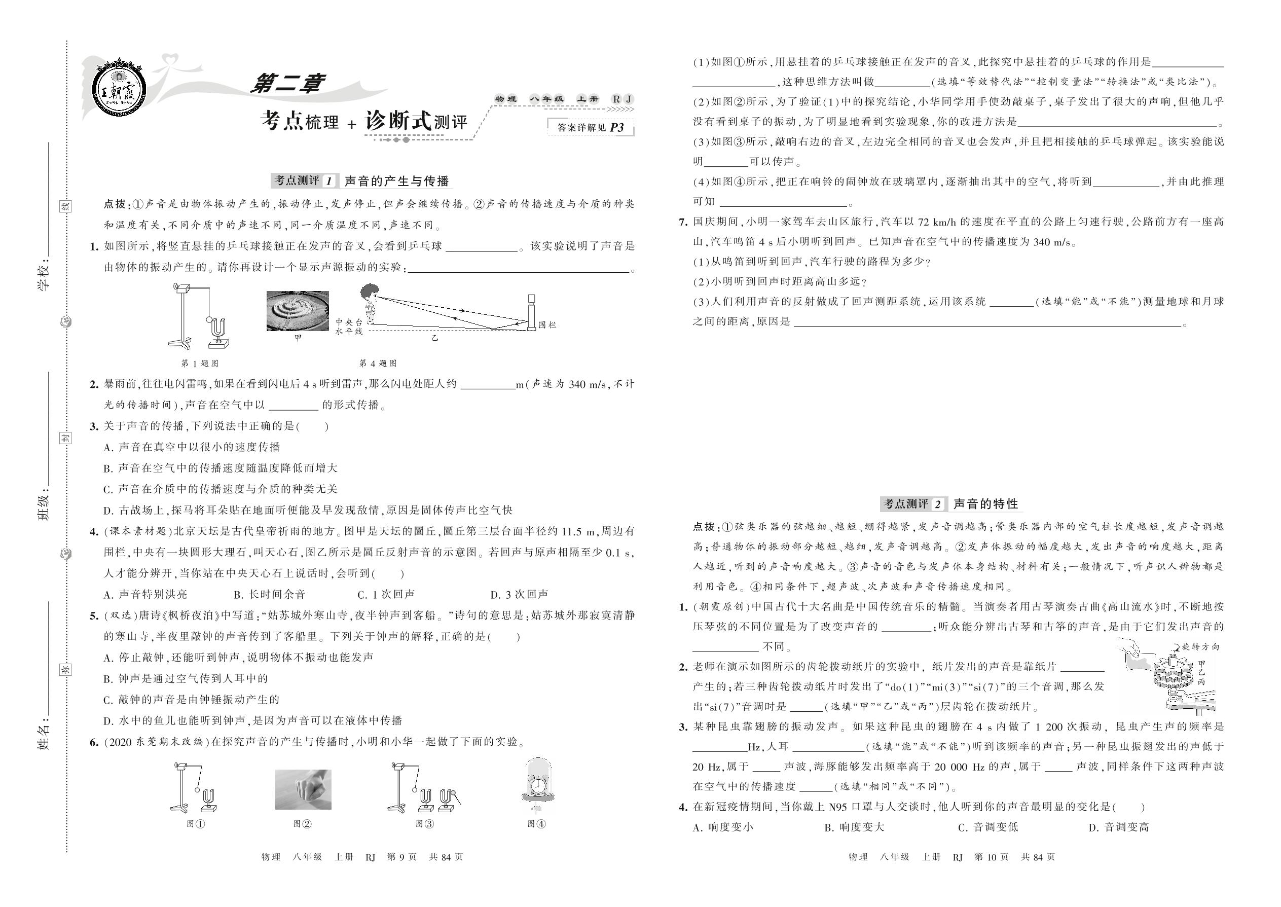 2021上册八年级物理人教版 第二章 考点梳理 + 诊断式测评