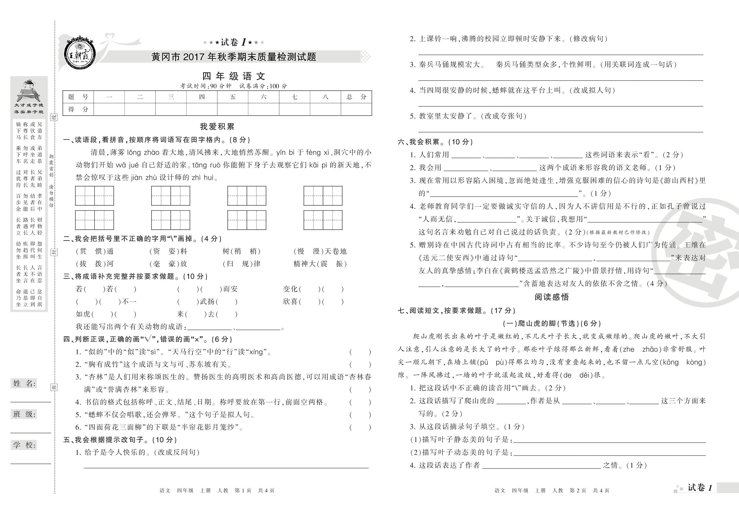 2017-2018学年第一学期黄冈市四年级语文试卷(人教版)【1】