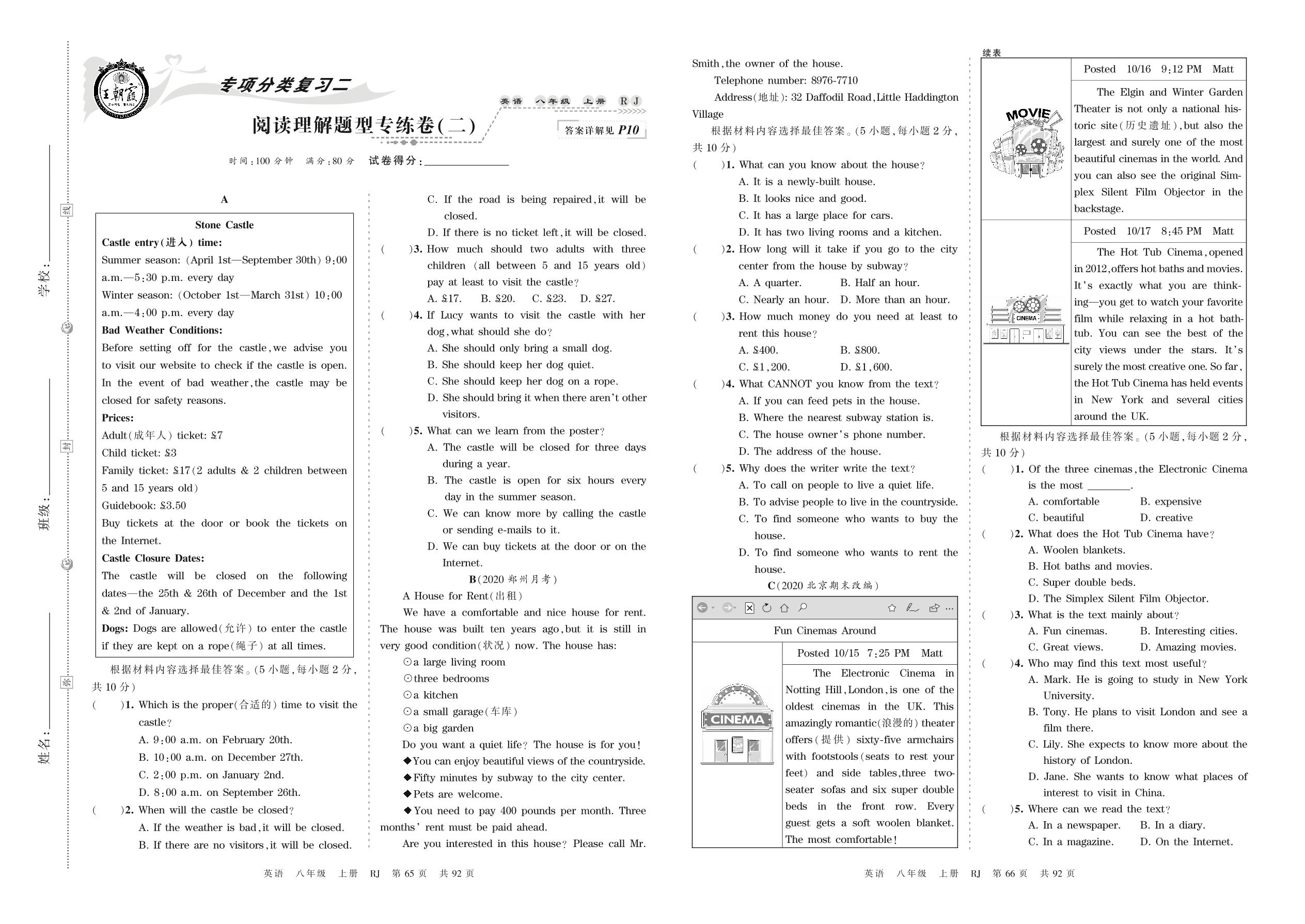 2021上册八年级英语人教版 阅读理解题型专练卷(二)