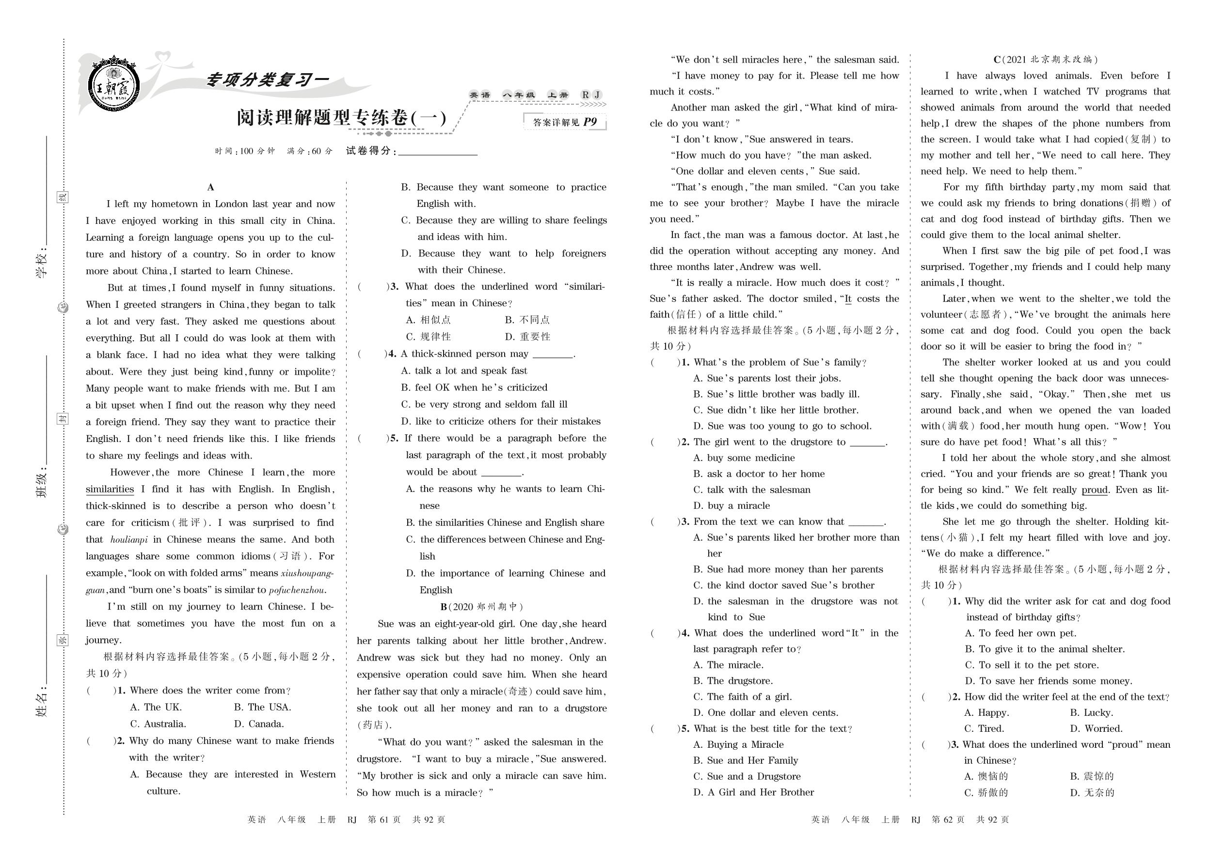 2021上册八年级英语人教版 阅读理解题型专练卷(一)