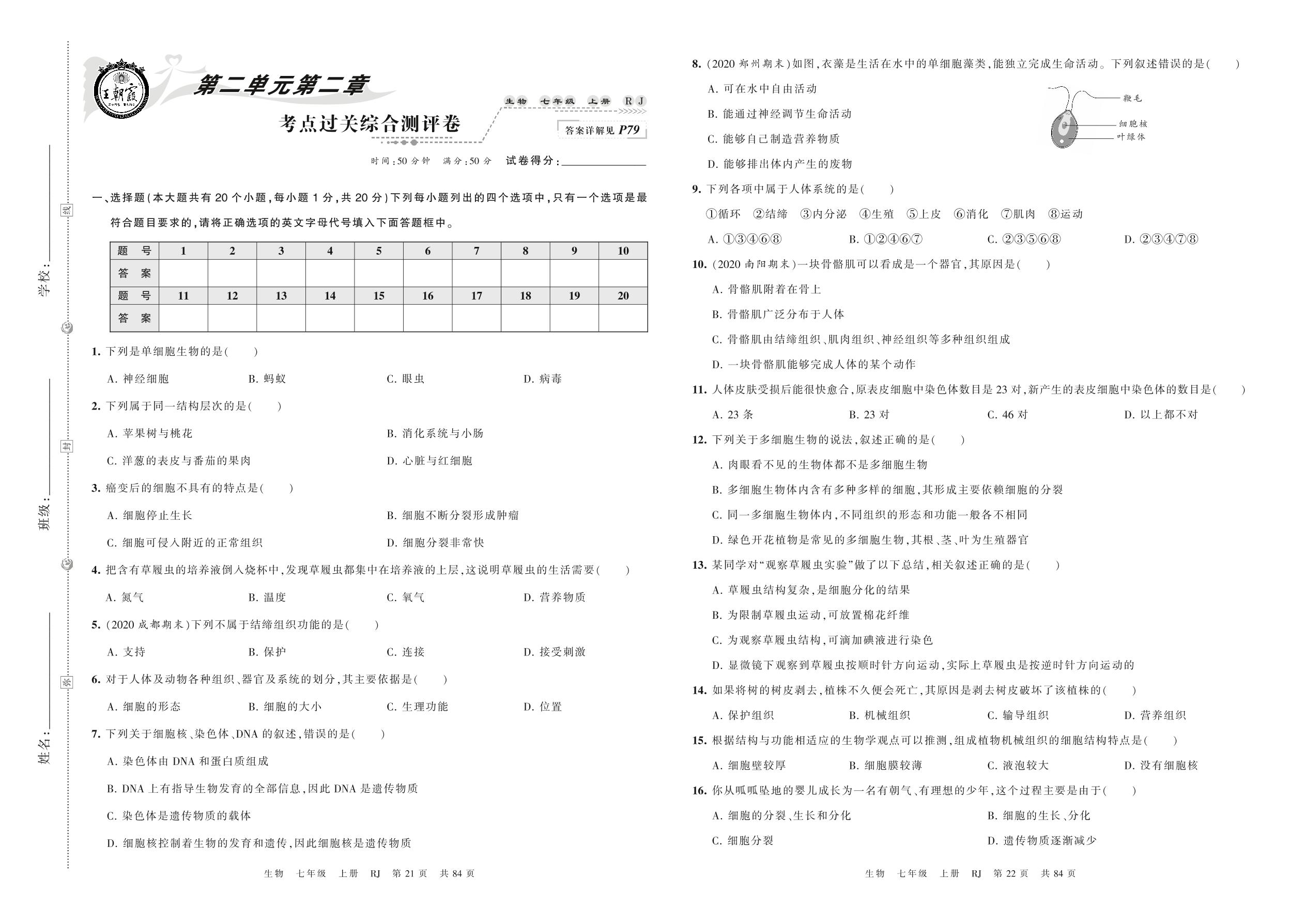 2021上册七年级生物人教版 第二单元第二章 考点过关综合测评卷