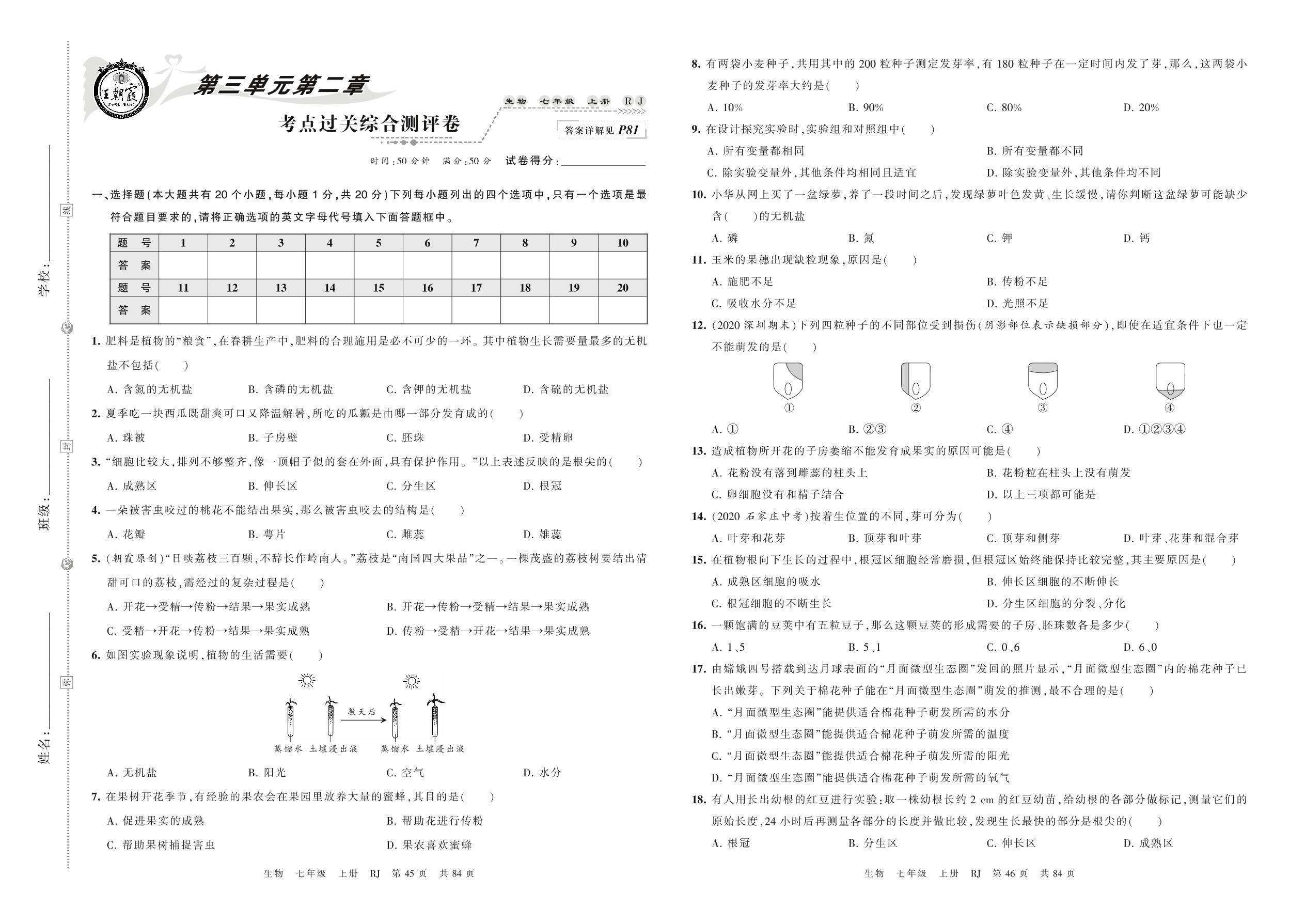2021上册七年级生物人教版 第三单元第二章 考点过关综合测评卷