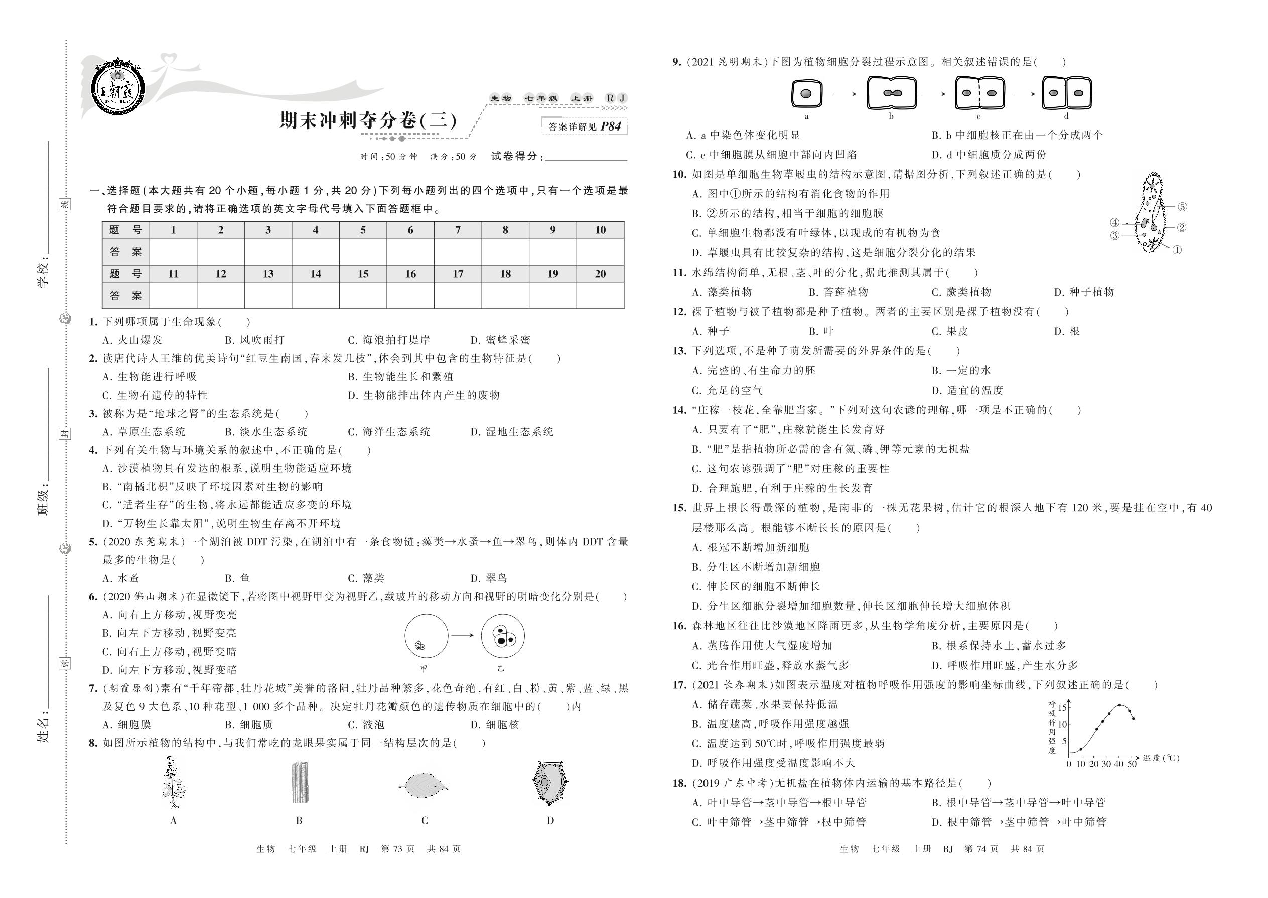 2021上册七年级生物人教版 期末冲刺夺分卷(三)